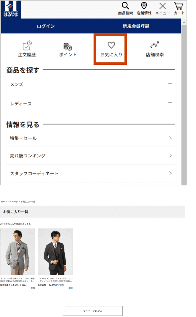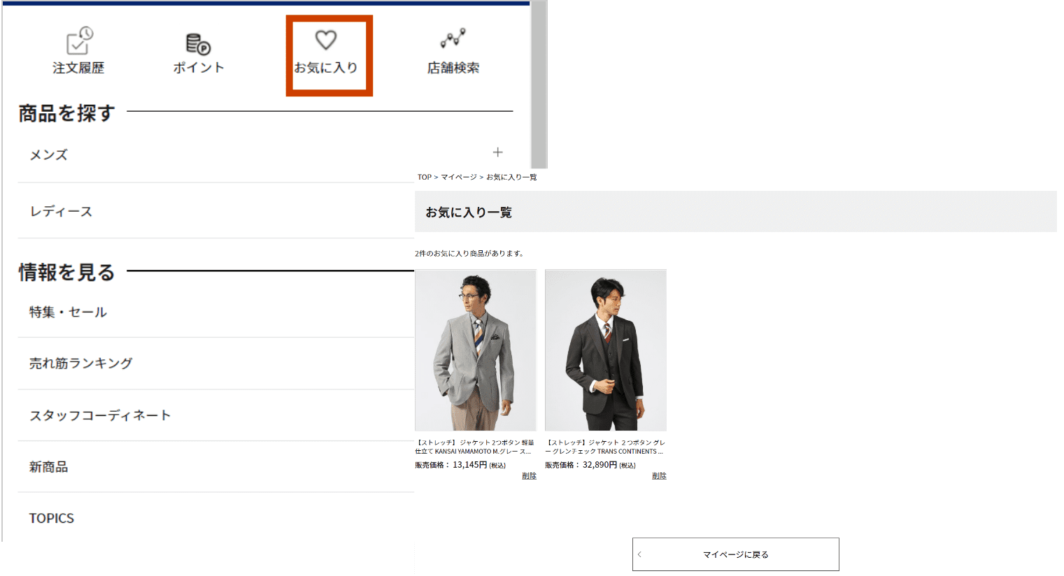 または右上「MY PAGE」から「お気に入り商品を確認する」からも確認可能です。