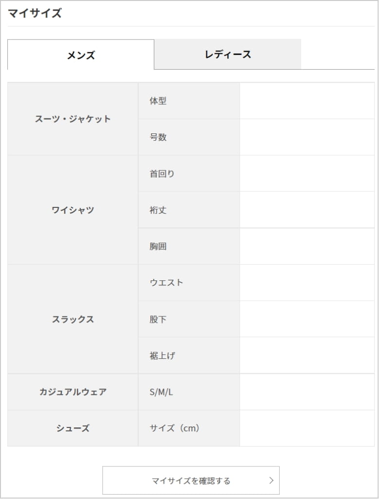 体型、号数、ウエスト、首回りなど、お客様のサイズを一度登録しておくと、サイズに合った商品を簡単に絞り込み!