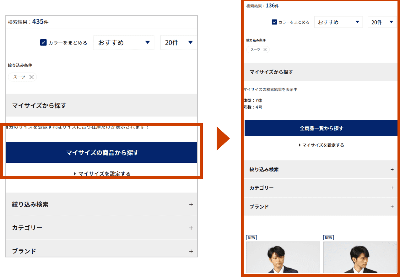 カテゴリページでは、ページの一番上にマイサイズのバナーが表示され、