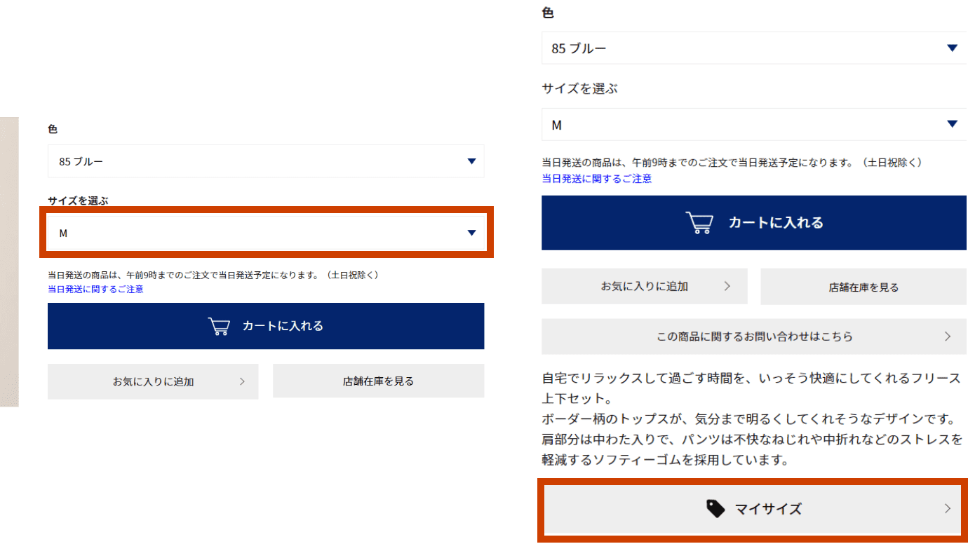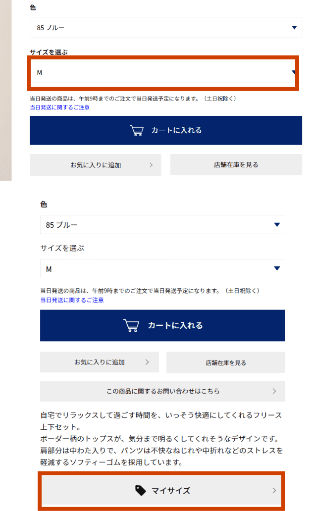 マイサイズを確認したい場合は商品説明の下の「マイサイズ」ボタンから確認できます。