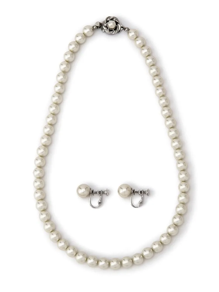 女性の冠婚葬祭行事に欠かせない、パールネックレスとイヤリングのセット。慶びの日にも悲しみの日にも取り入れられる、品の良さとベーシックさを併せ持った一品です。硝子パールを使用しており、程よい艶感が表情を美しく引き立ててくれます。こちらは清潔感溢れるホワイトカラーです。