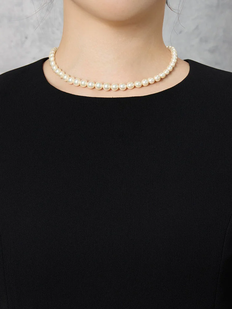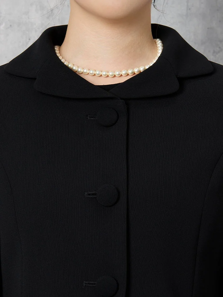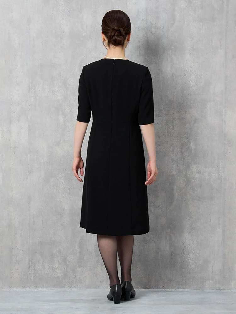 クラシックな5分袖ワンピースに、コンパクトなカラーが特徴のショートジャケットを組み合わせました。