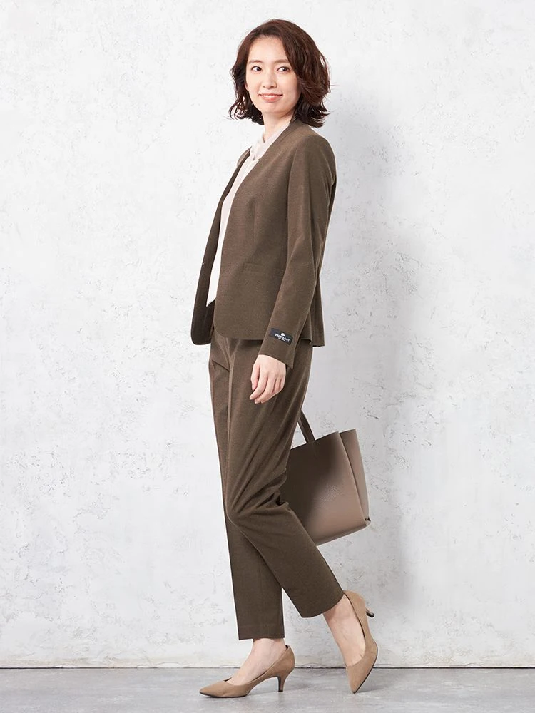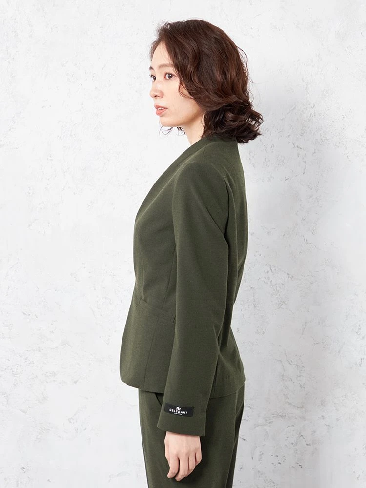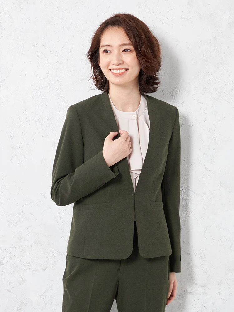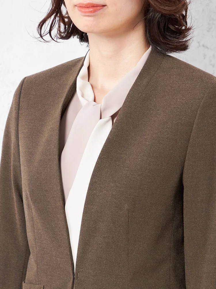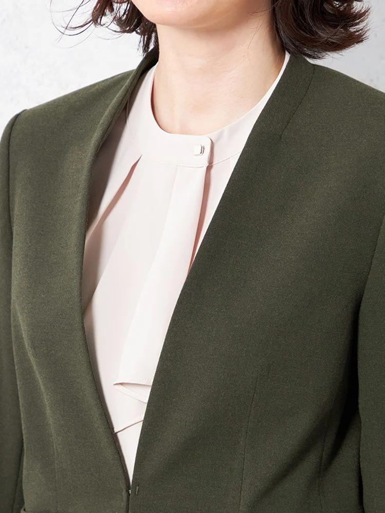 上品な佇まいのノーカラーデザインは、ブラウスはもちろん、タートルネックなどのインナーとも相性が良いのが特徴です。