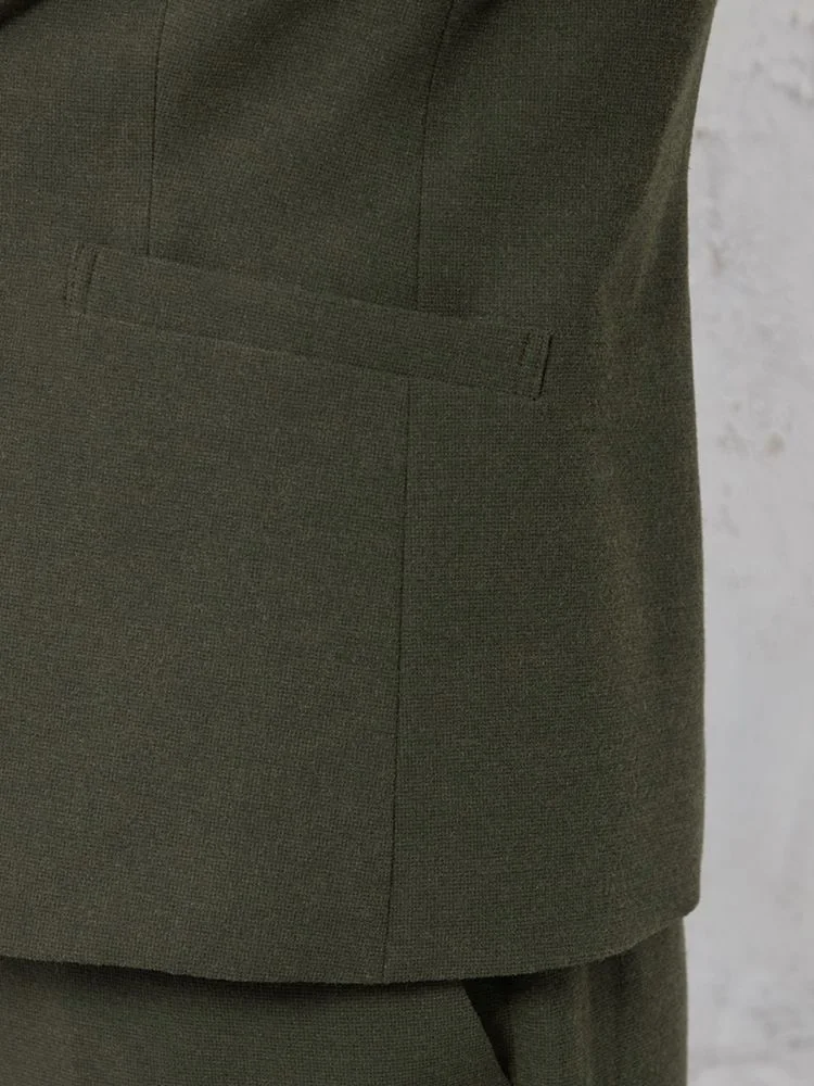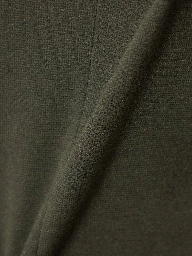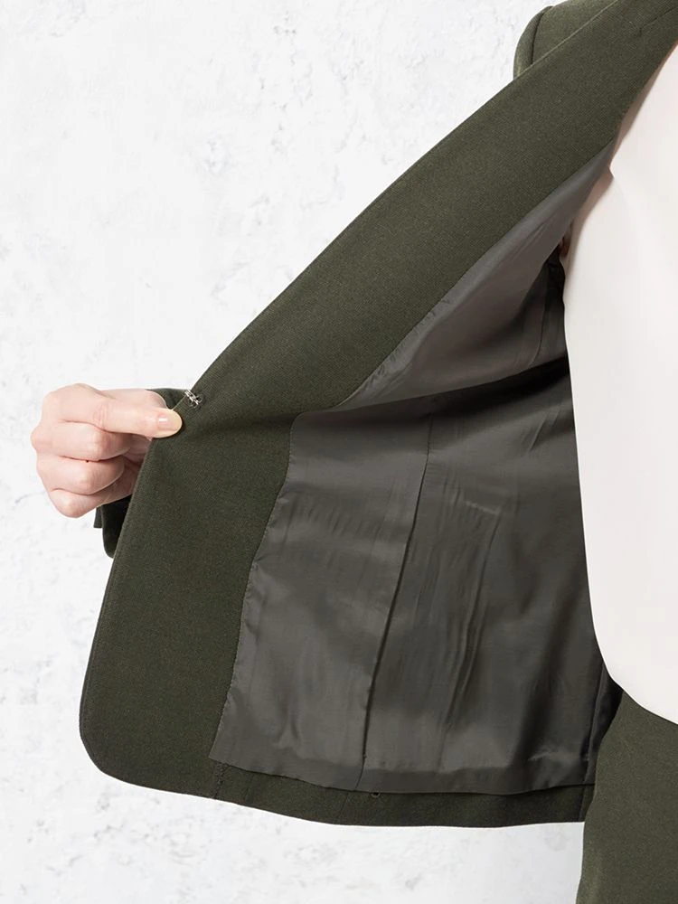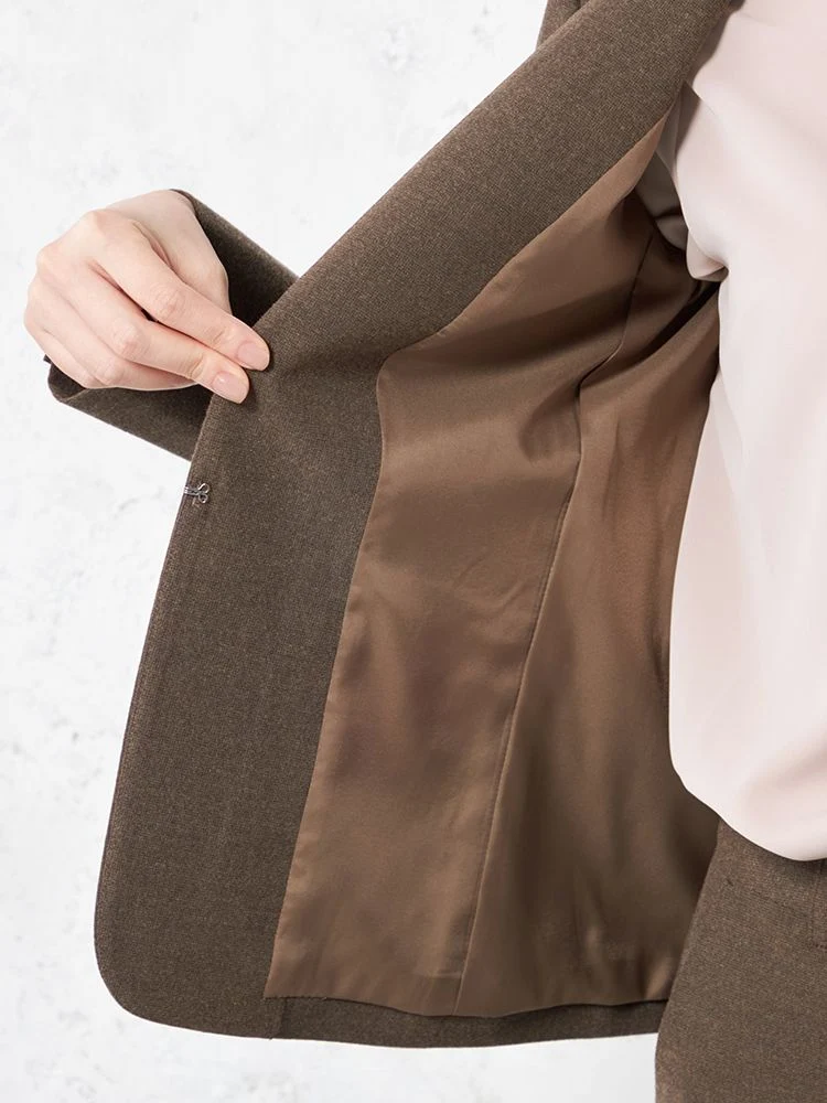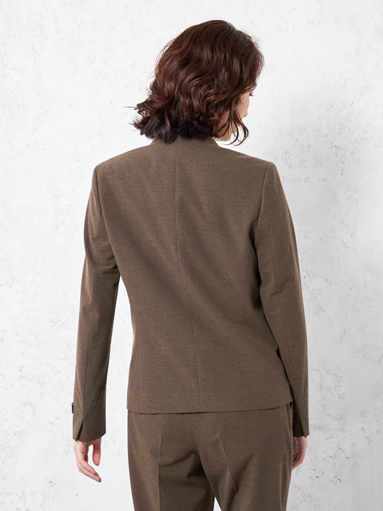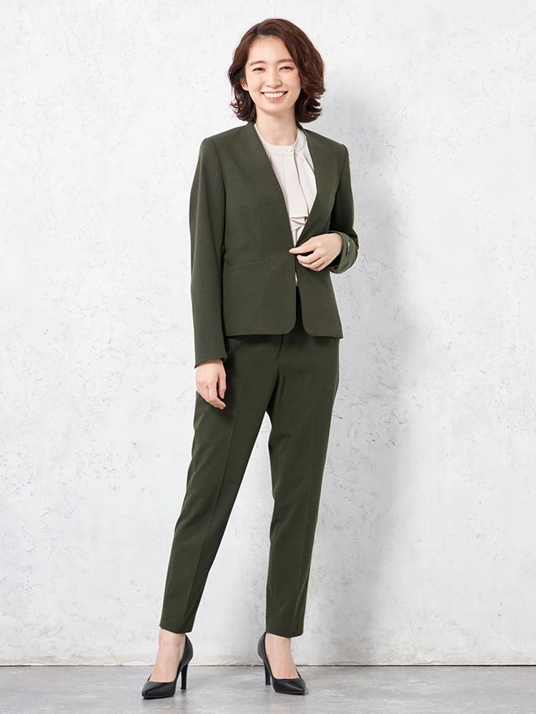 上品な佇まいのノーカラーデザインは、ブラウスはもちろん、タートルネックなどのインナーとも相性が良いのが特徴です。