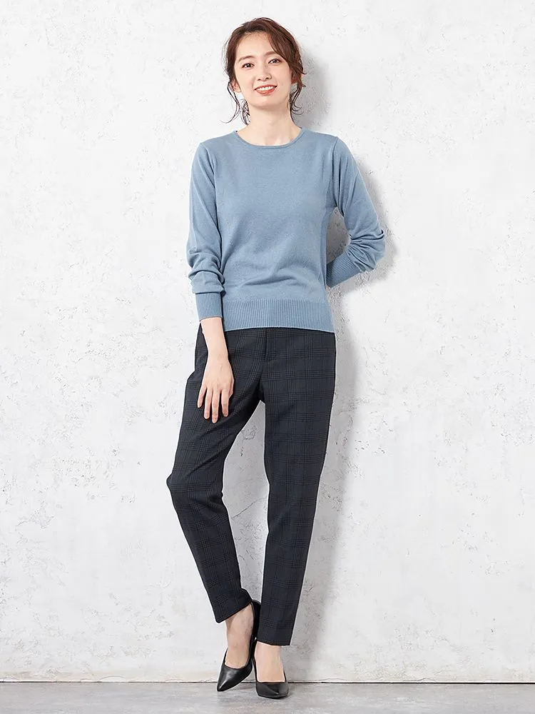 定番のクルーネックは、単体使いも重ね着もできる使い勝手の良さが魅力。