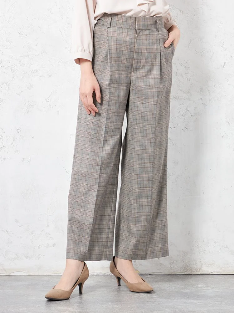 【働ラク肩ラクスーツ】パンツワイドウォッシャブルストレッチグレーチェックSOFFICE秋冬【レディース】