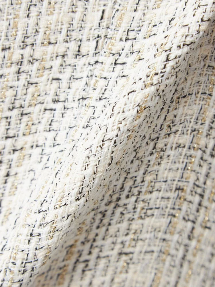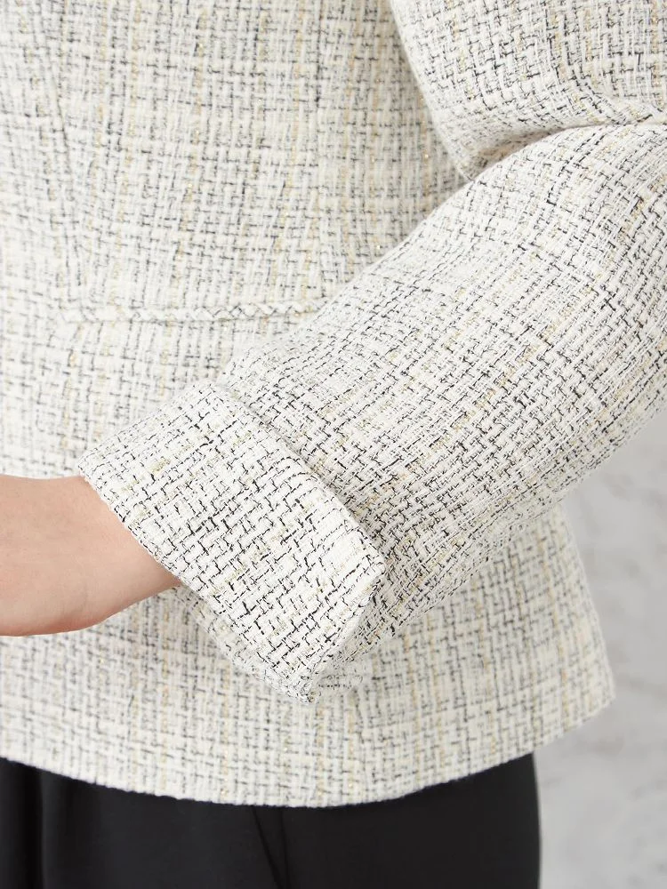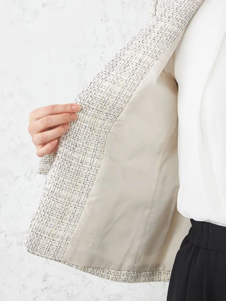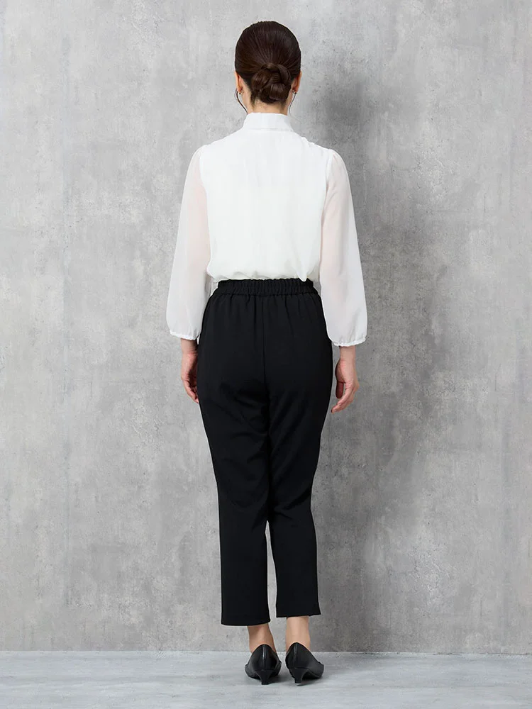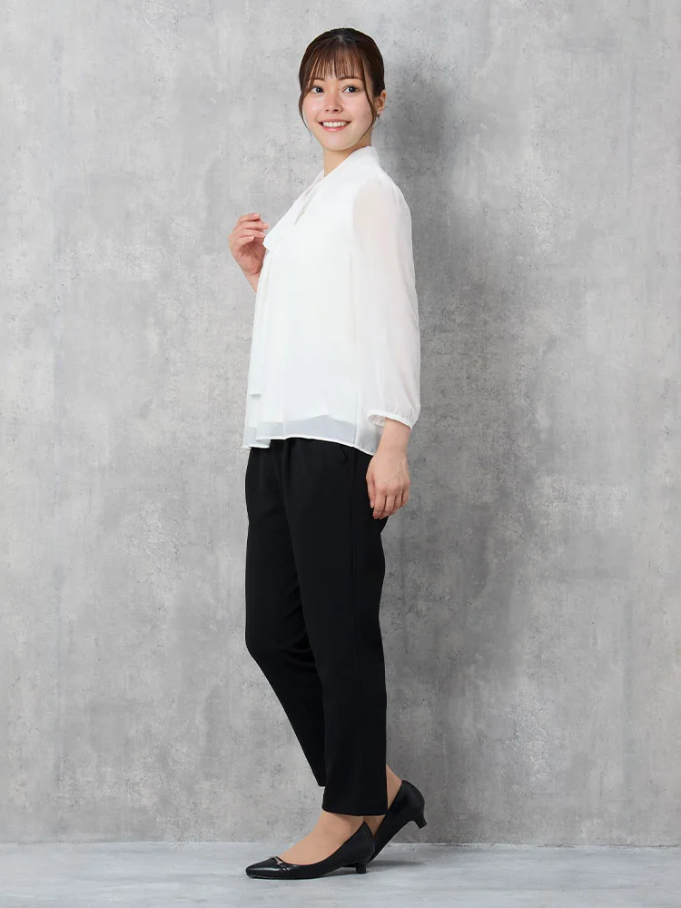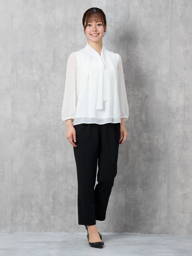 ツイードジャケットとボウタイブラウス、無地のテーパードパンツをセットにしました。