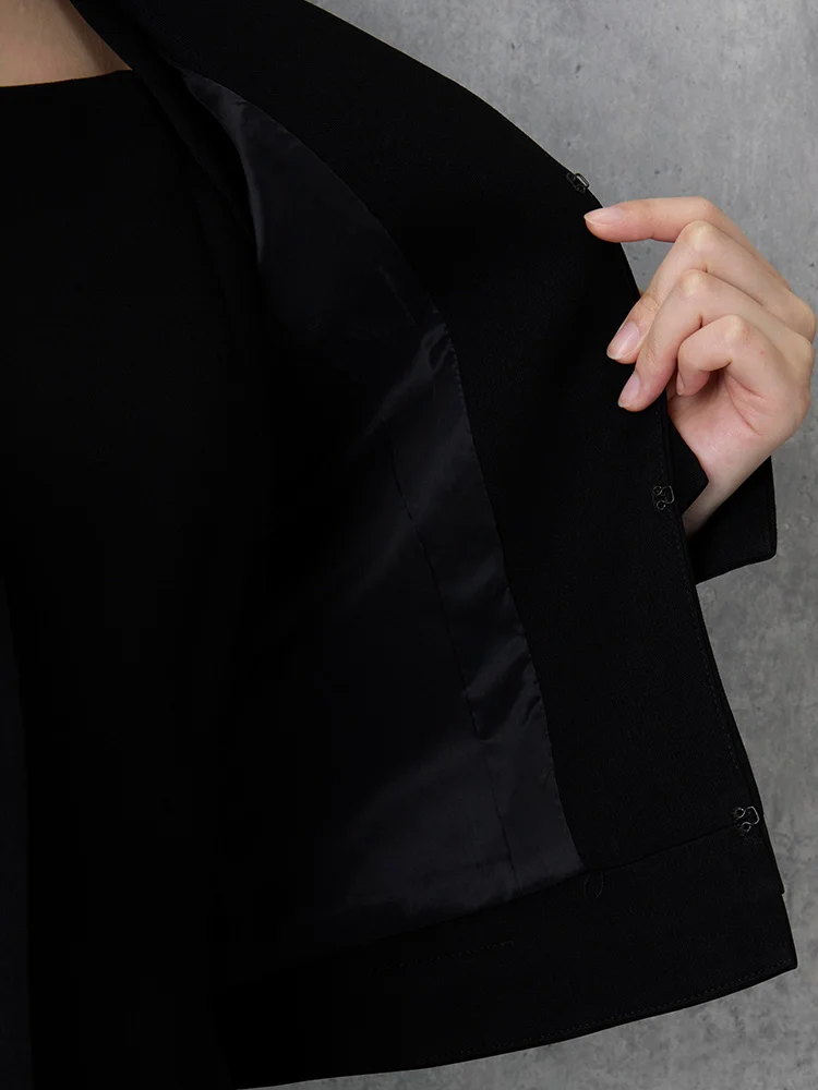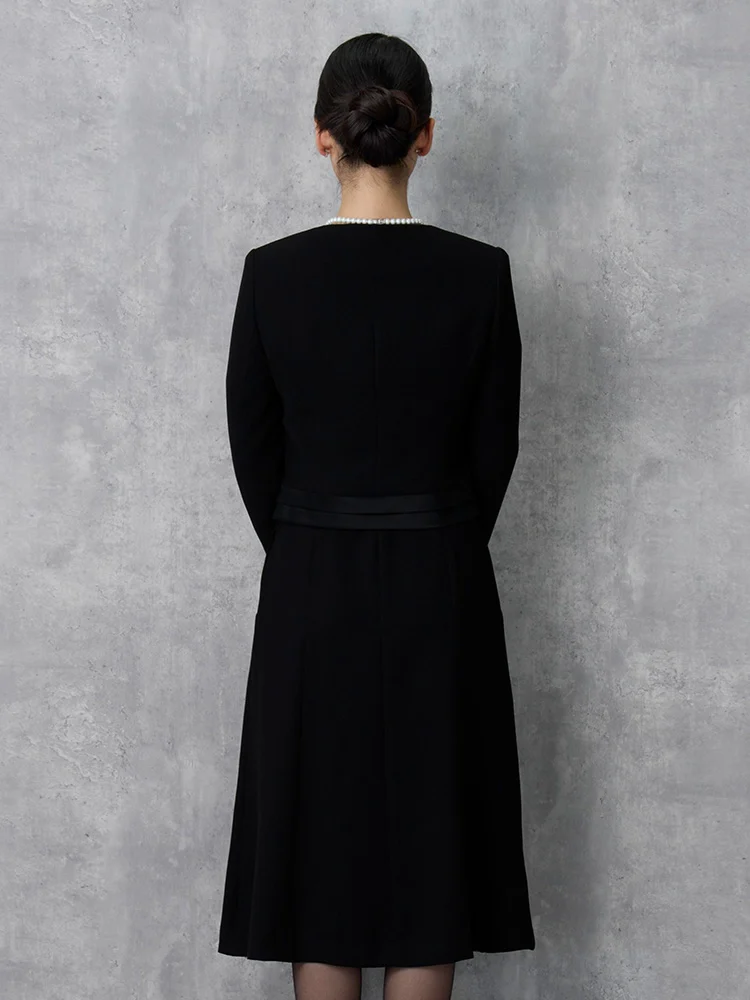 7分袖ワンピースとノーカラージャケットを組み合わせた、フォーマル対応のセットアップです。