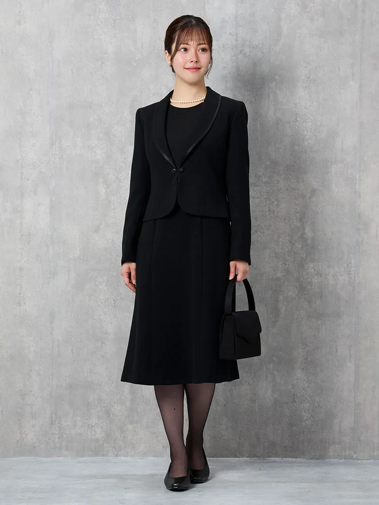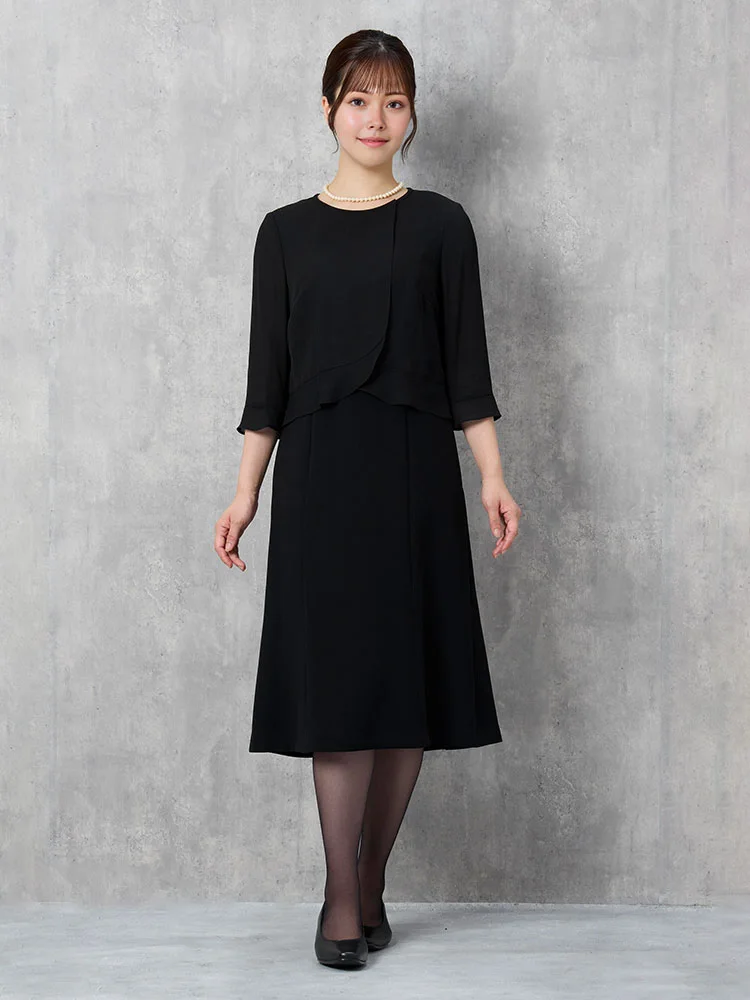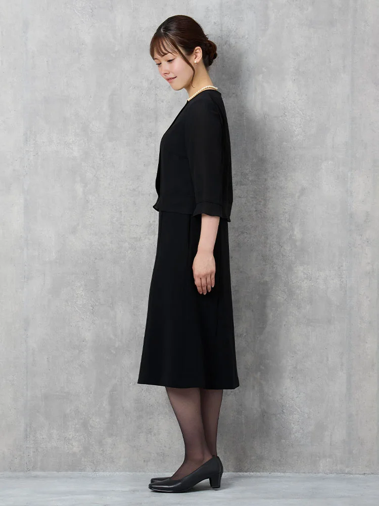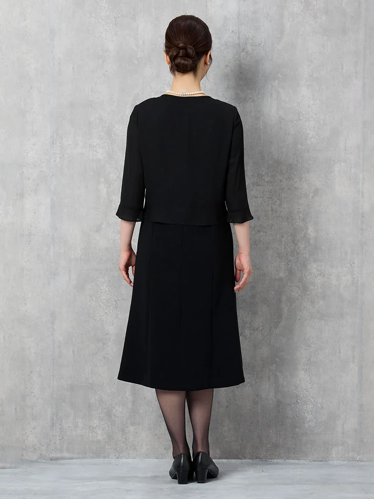 セットアップ風のワンピースと、ヘチマカラーのジャケットをセットにした、ブラックフォーマル対応のアンサンブルになります。