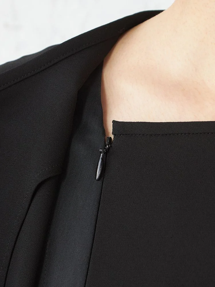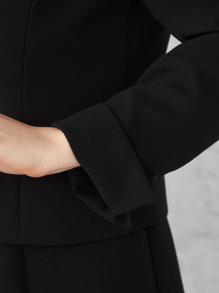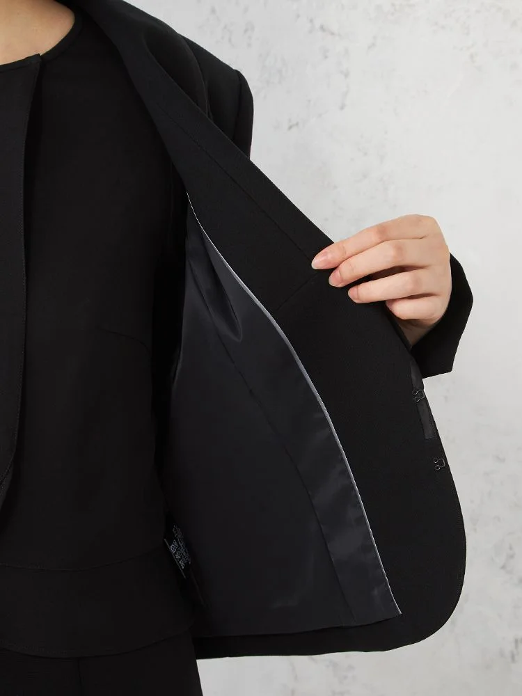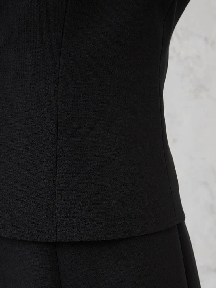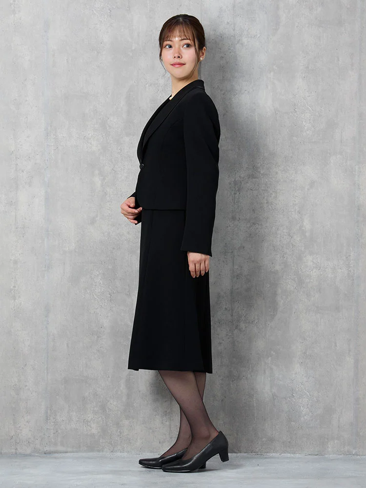 セットアップ風のワンピースと、ヘチマカラーのジャケットをセットにした、ブラックフォーマル対応のアンサンブルになります。