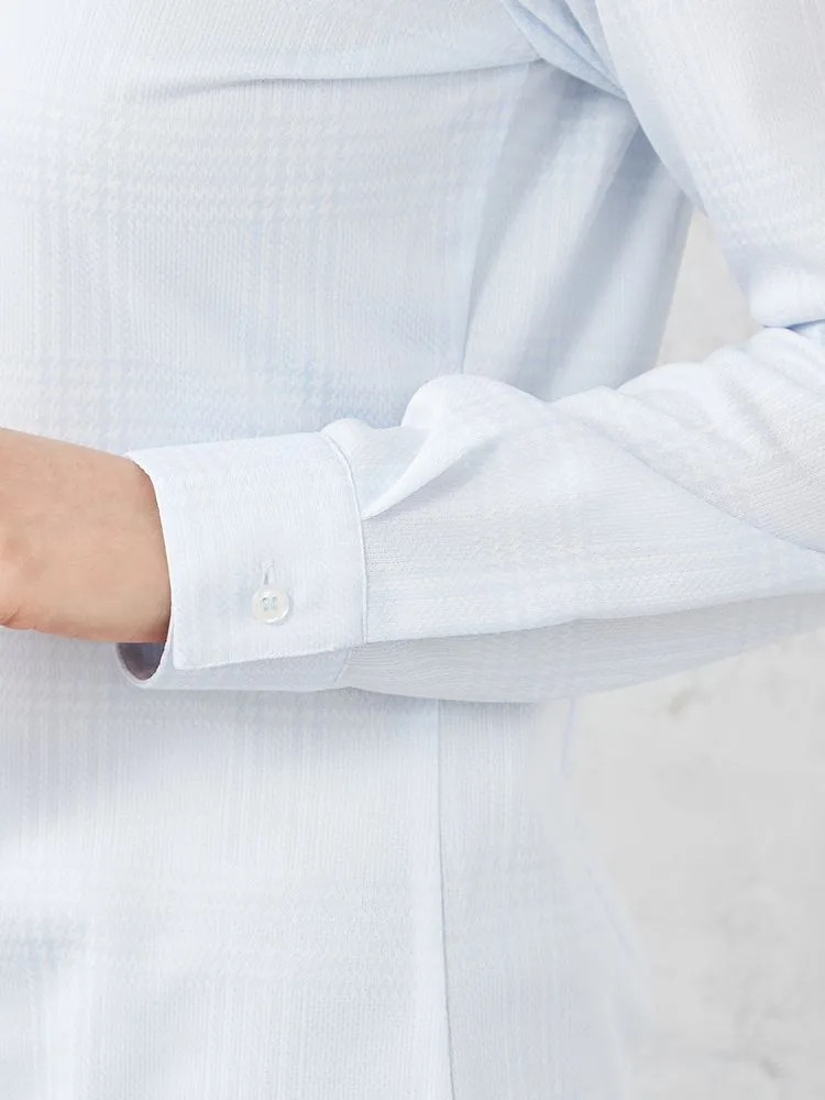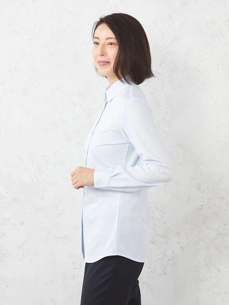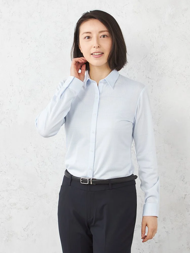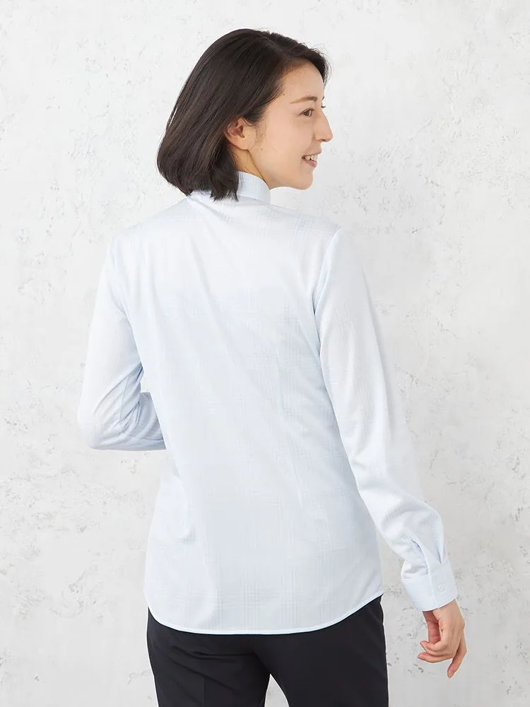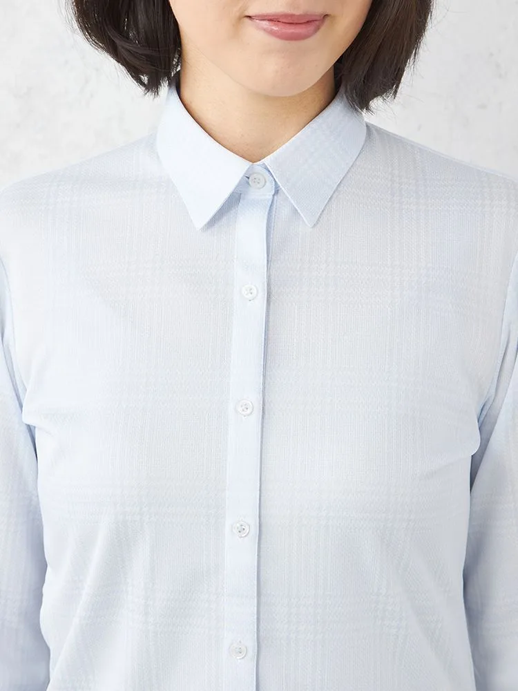 【完全ノーアイロン】アイシャツ 長袖 ブラウス レギュラーカラー グレンチェック i-shirt 通年【レディース】(サックス)