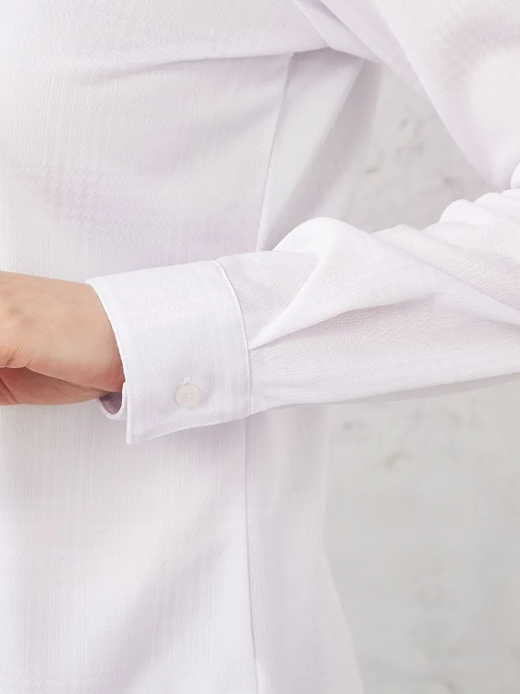 完全ノーアイロン機能付きで、忙しい朝でもシワを気にせずにそのまま着用できます。手間を省ける便利なアイテムです。