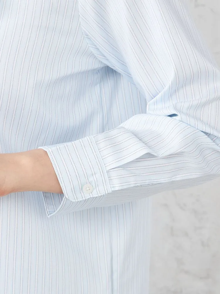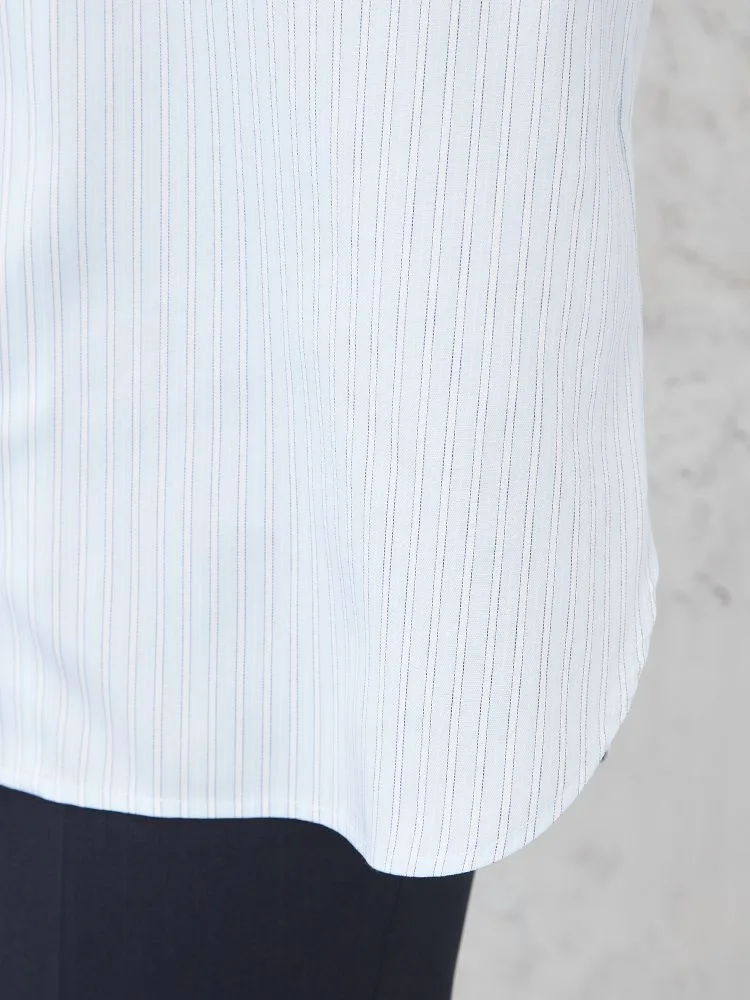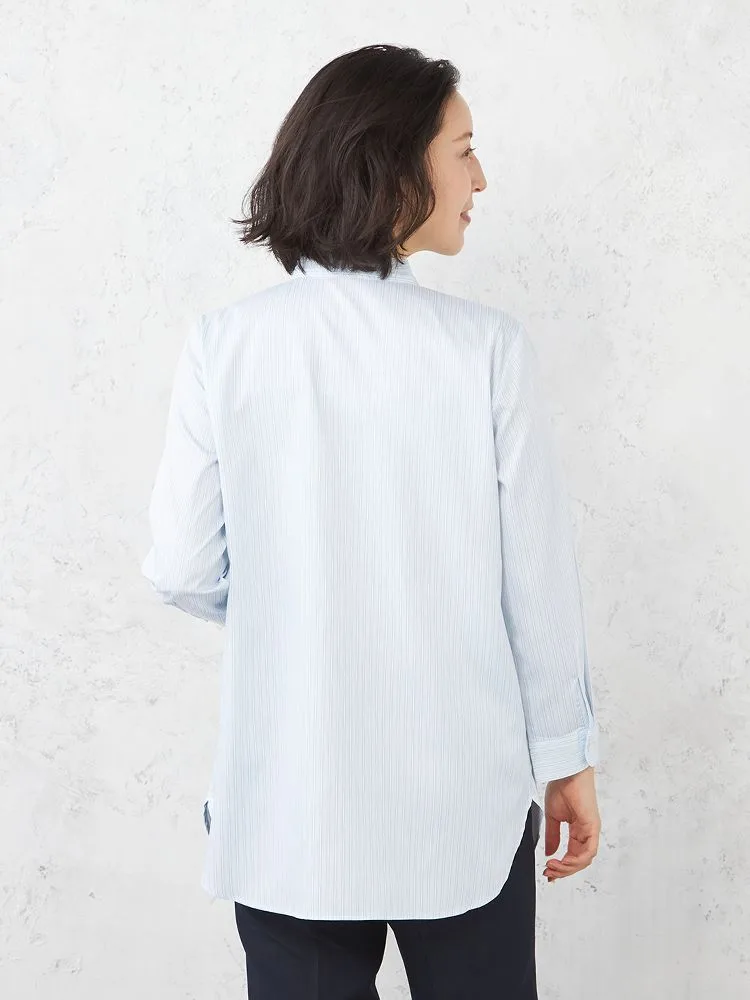 【ハイブリッドアイシャツ】長袖ブラウスバンドカラーストライプ綿混素材形態安定通年【レディース】