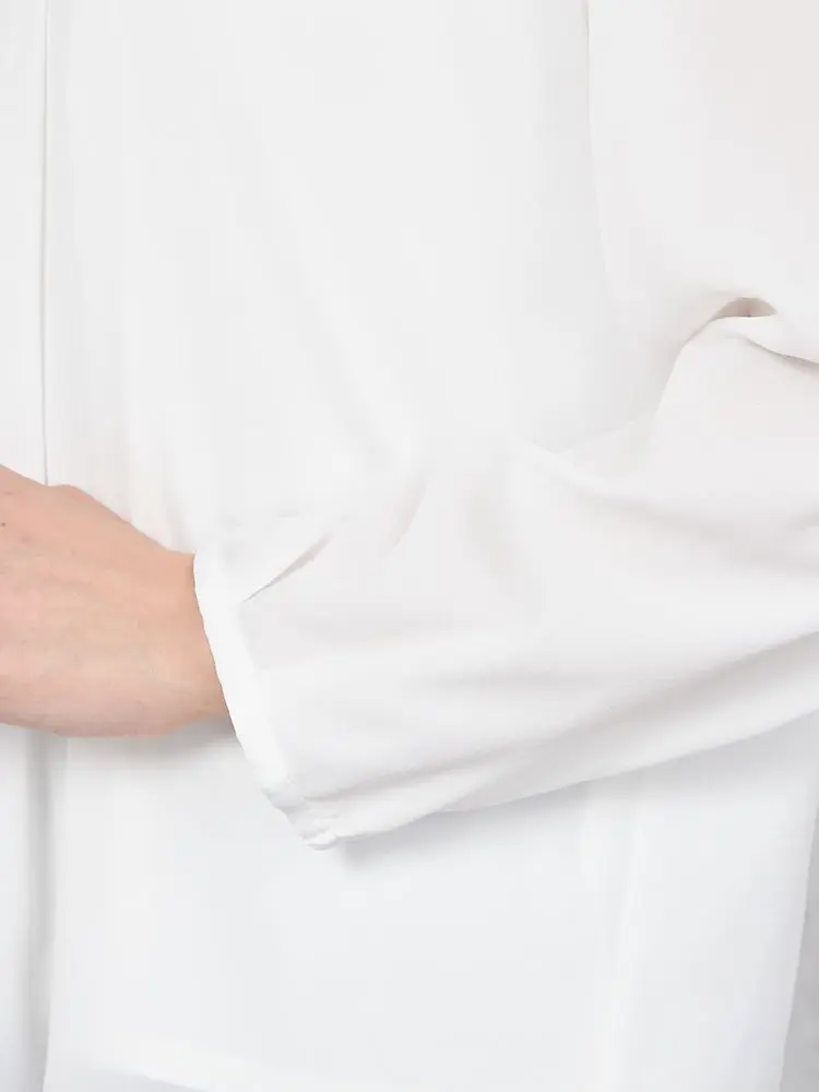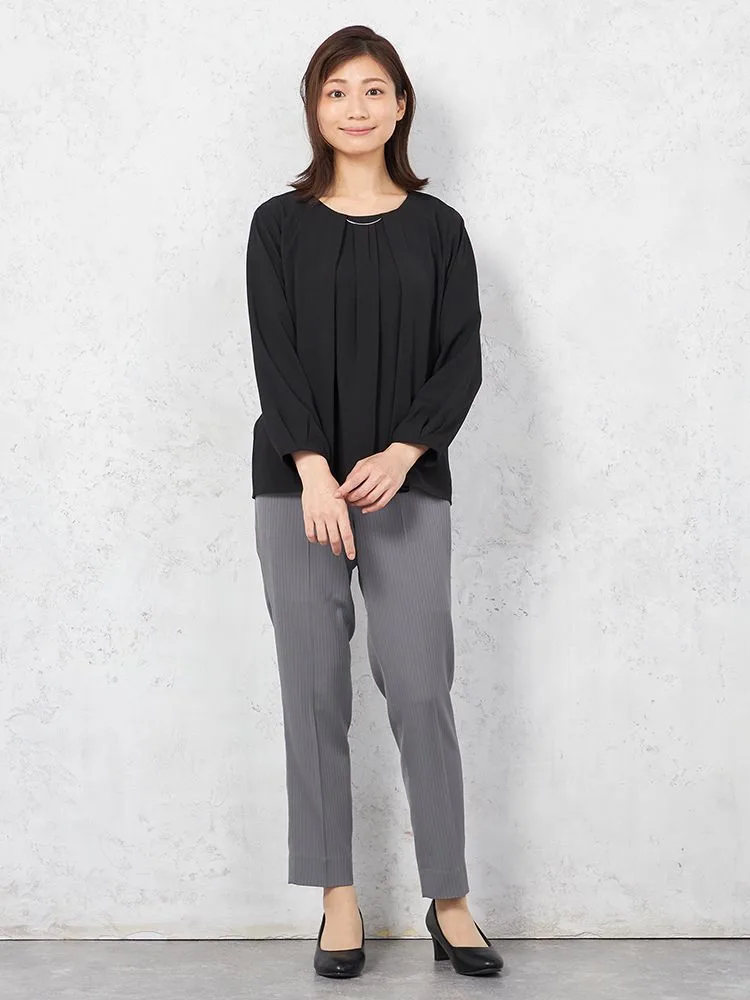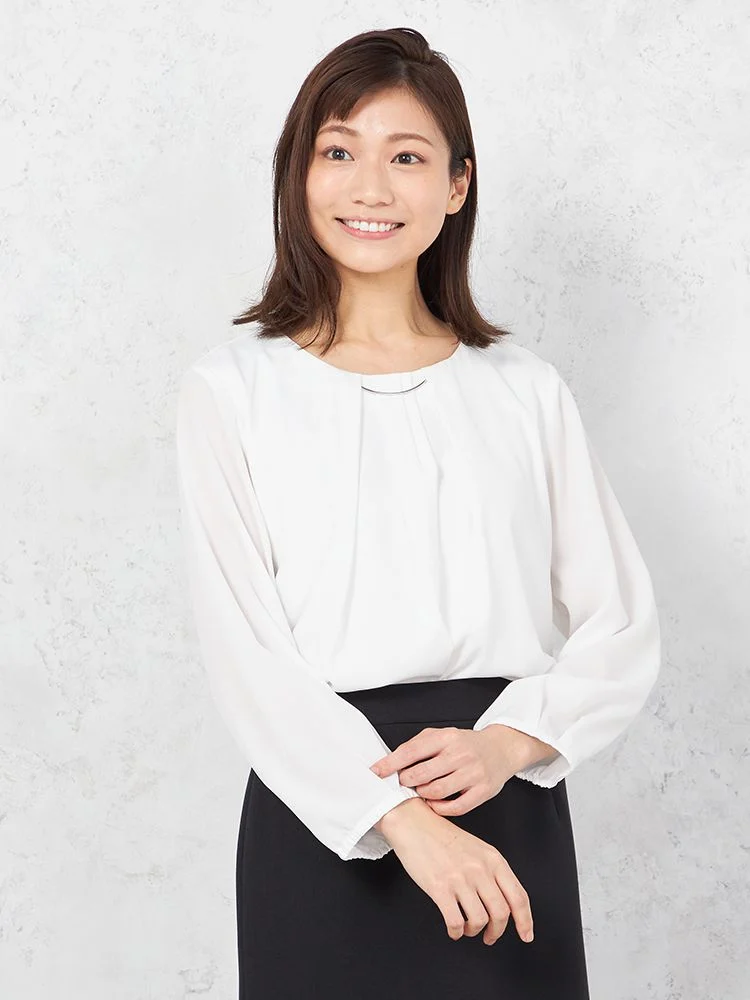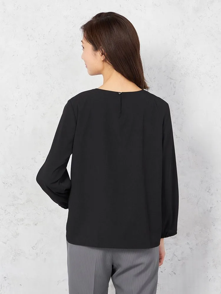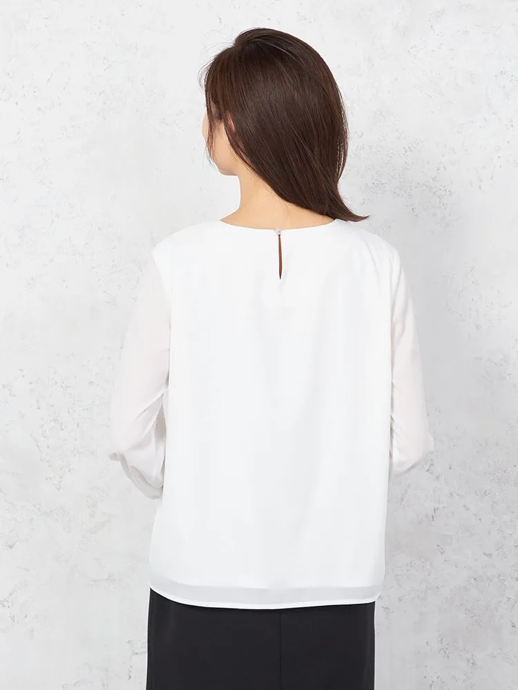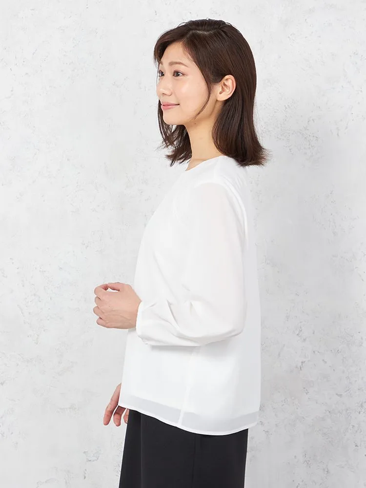 身生地を2枚重ねにし、気になる透けを抑えた長袖プルオーバーブラウス。