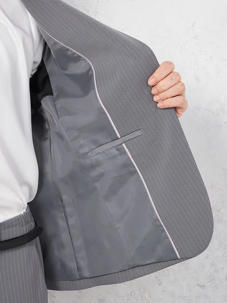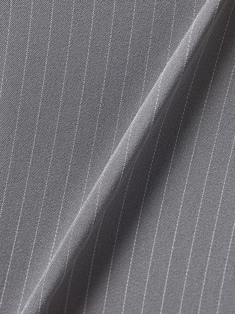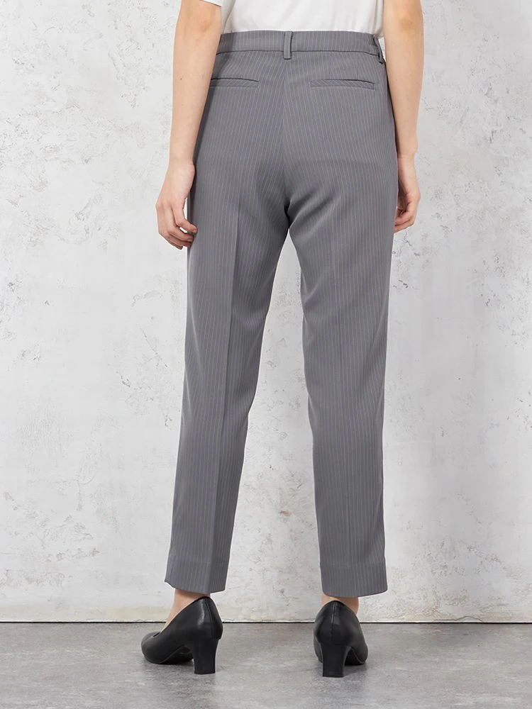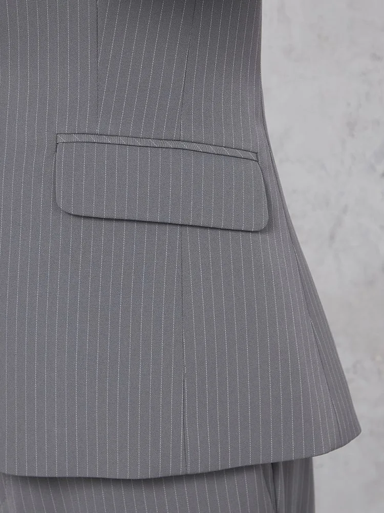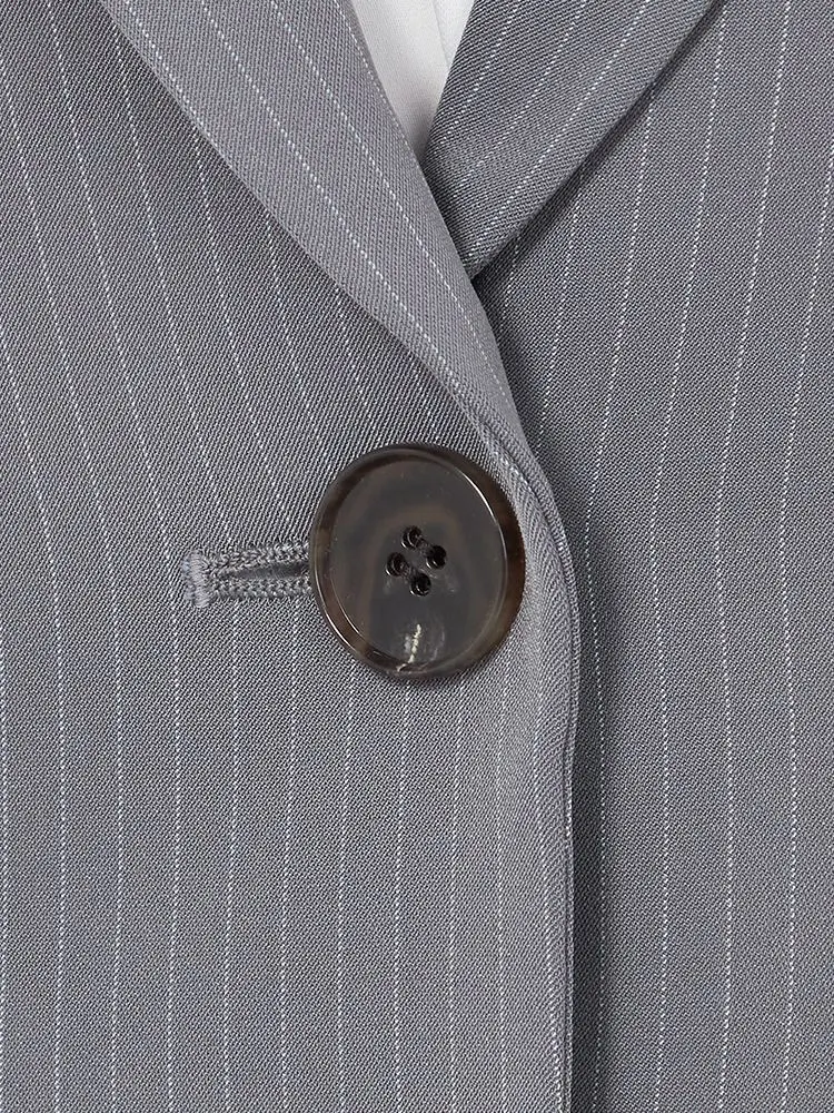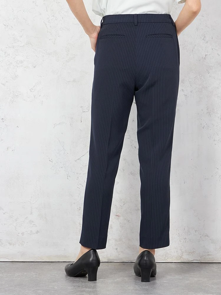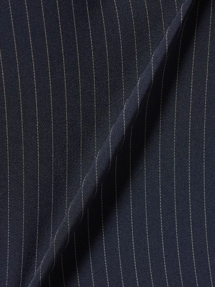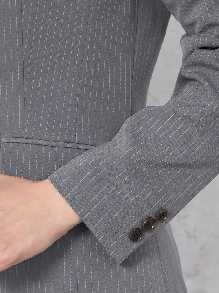 クールな印象を引き立てる、ピンストライプ柄のパンツスーツ。