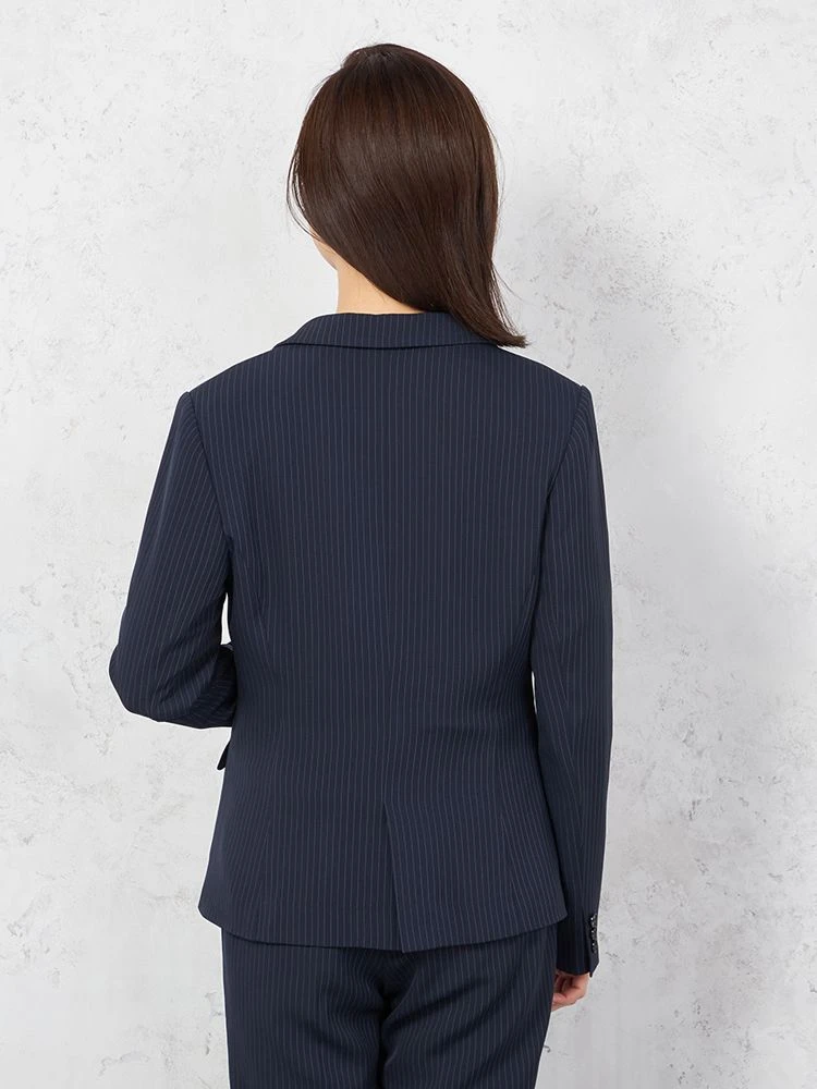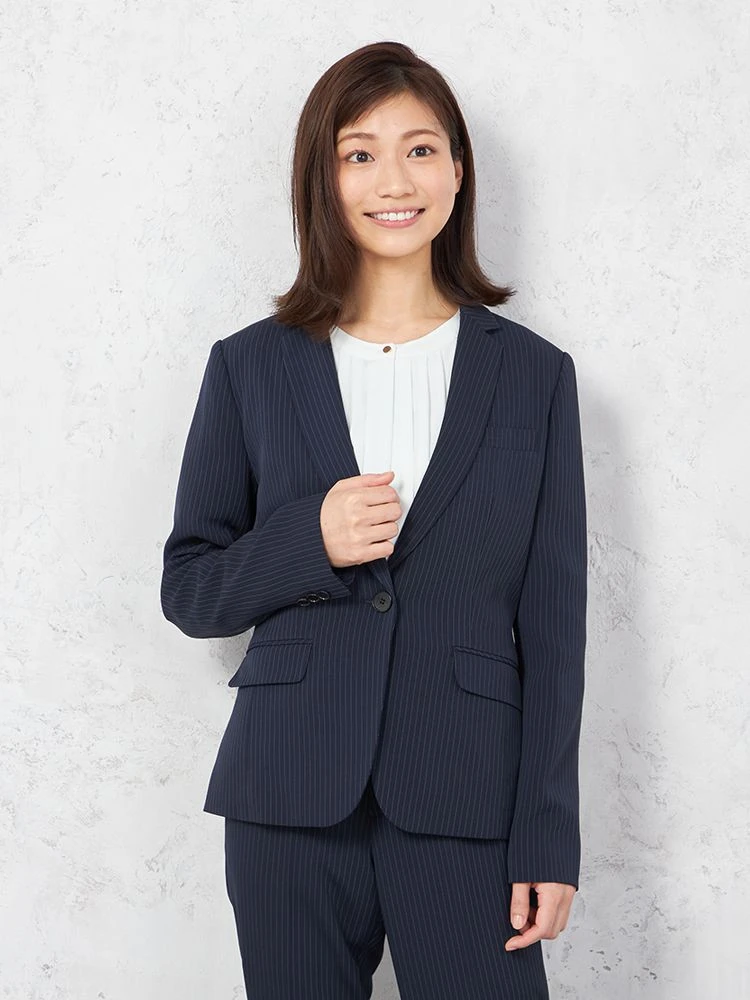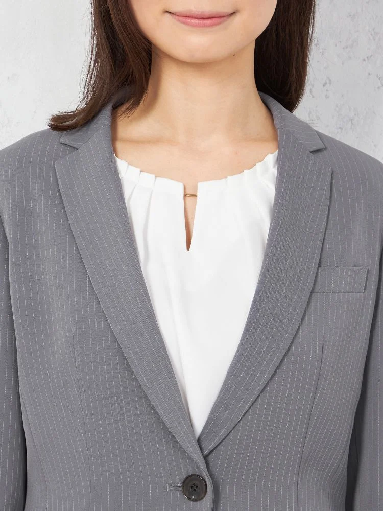 ジャケットはやや丸みをもたせたノッチドラペルとワンボタンで、女性らしく着こなせるよう仕上げています。