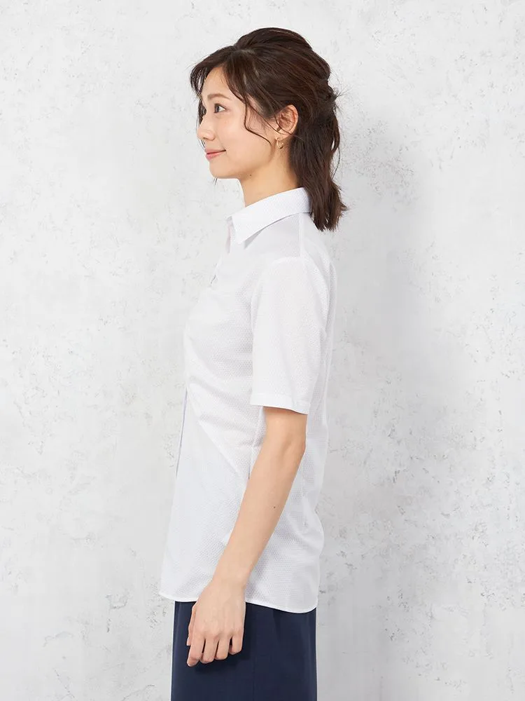 【完全ノーアイロン】i-shirtバイオセンサー半袖ブラウスギャザースキッパー白織柄無地アイシャツ春夏【レディース】