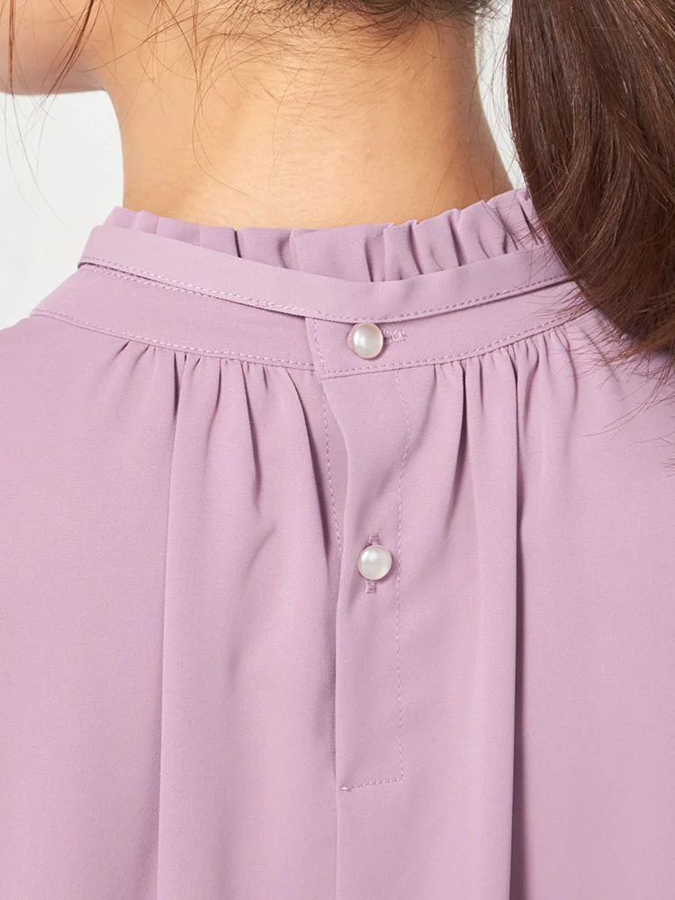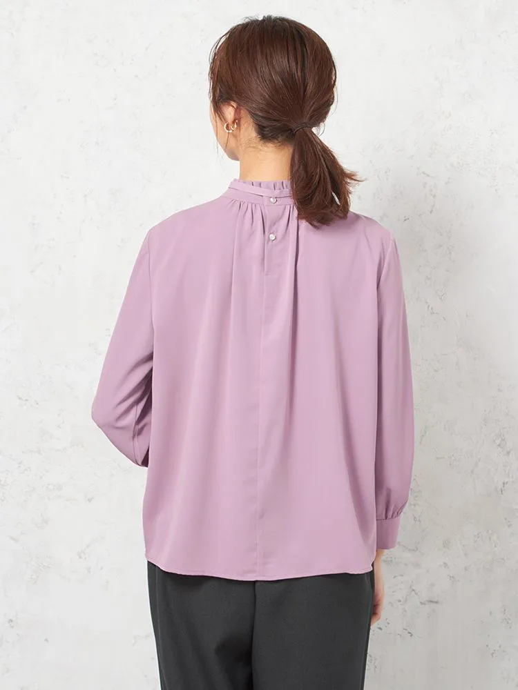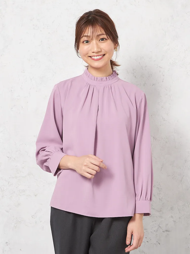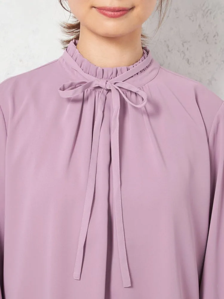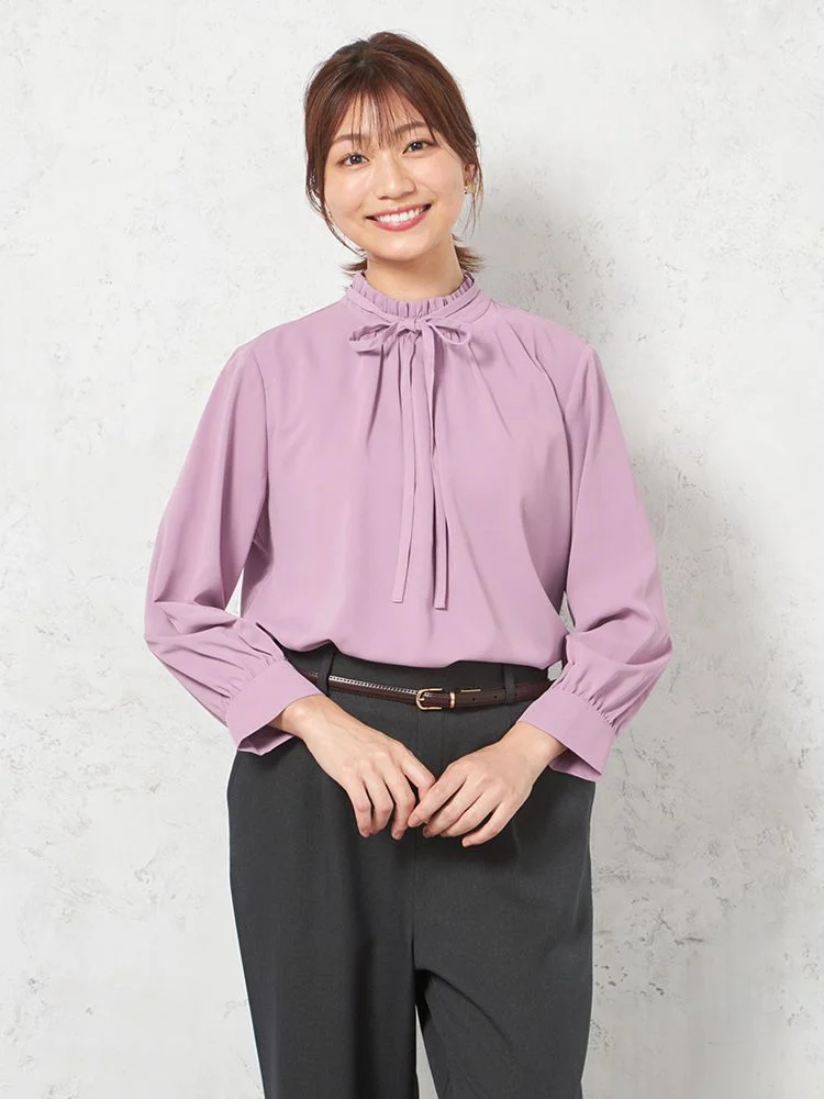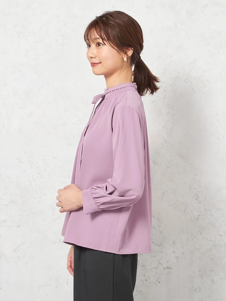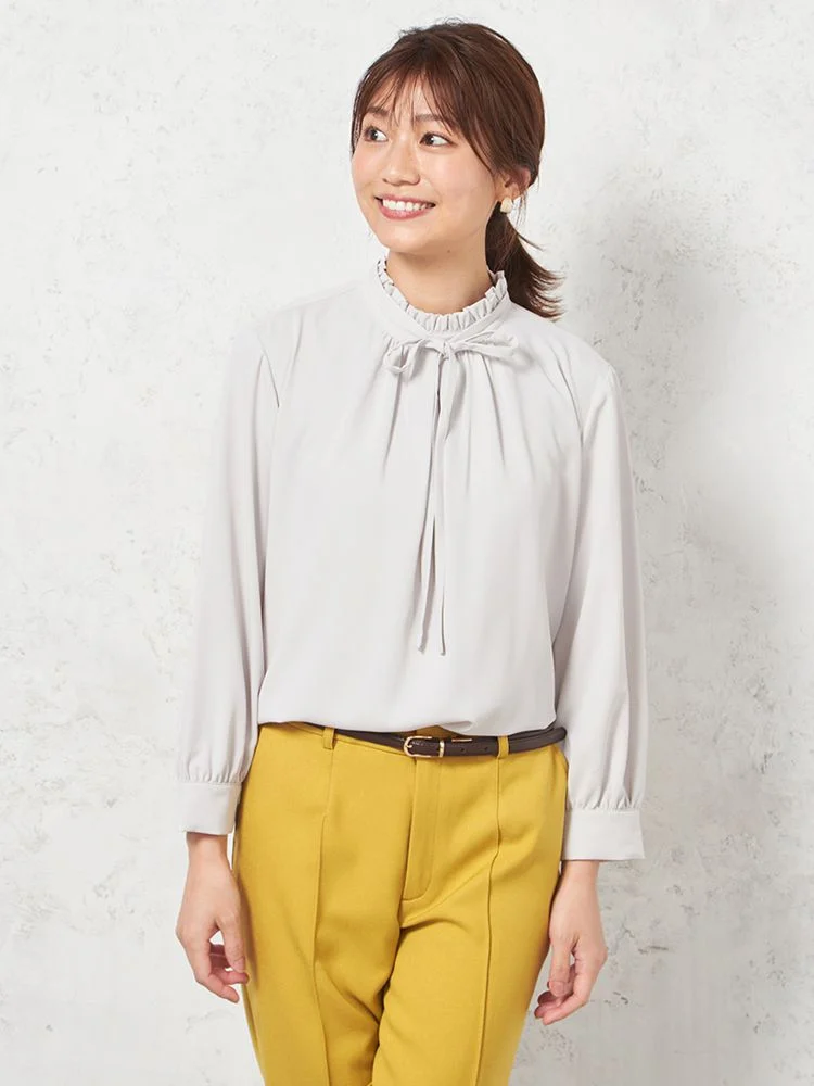 華奢なリボンが可愛らしい8分袖ブラウス。フリルが目を引くコンパクトなスタンドカラーも魅力の理由。
