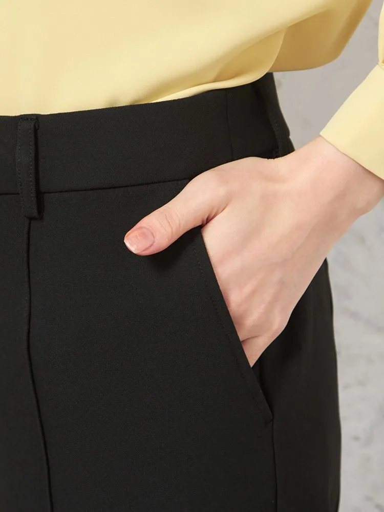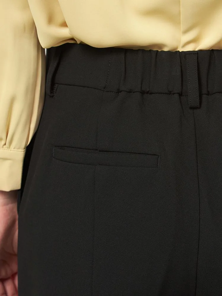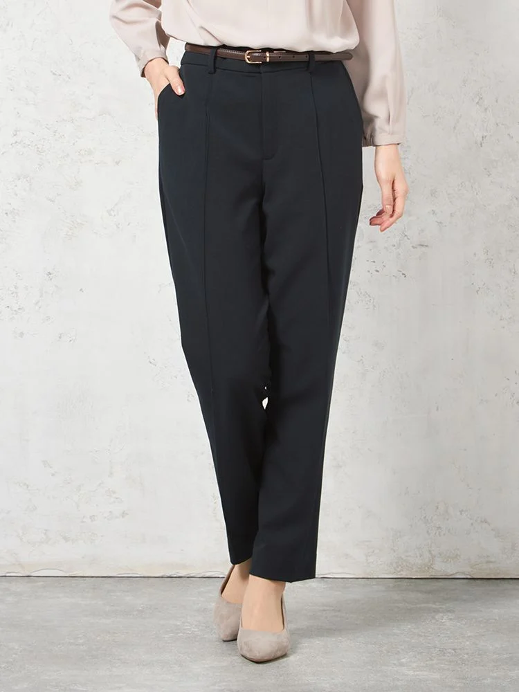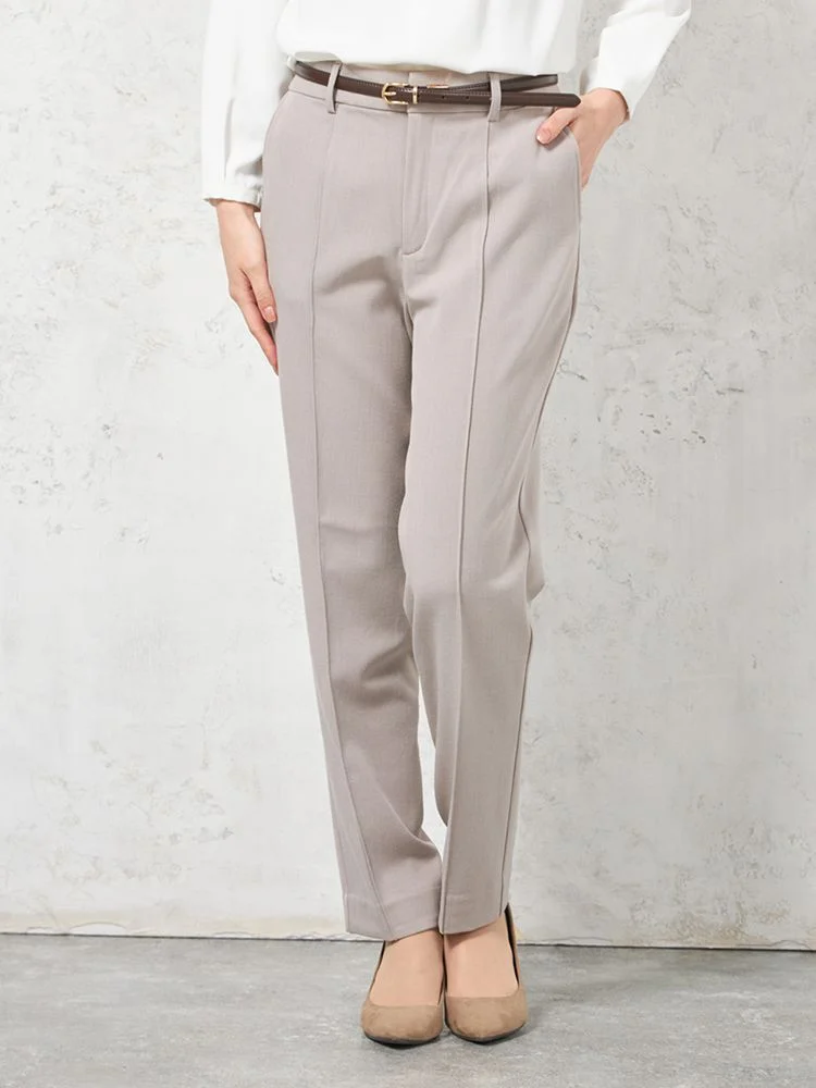 パンツの腰回りに生地の折り込みがなく、スッキリとしたシルエットを実現します。シンプルで洗練された印象を与え、すっきりとした着こなしが可能です。