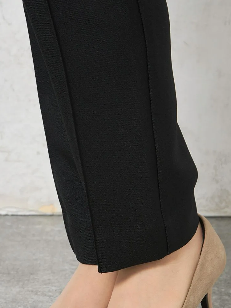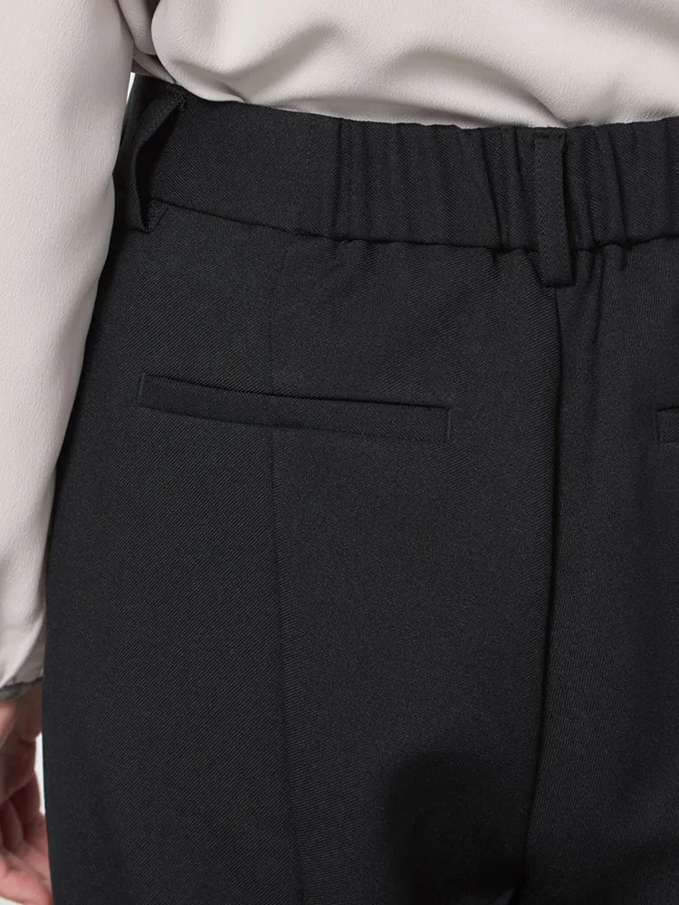 パンツの腰回りに生地の折り込みがなく、スッキリとしたシルエットを実現します。シンプルで洗練された印象を与え、すっきりとした着こなしが可能です。