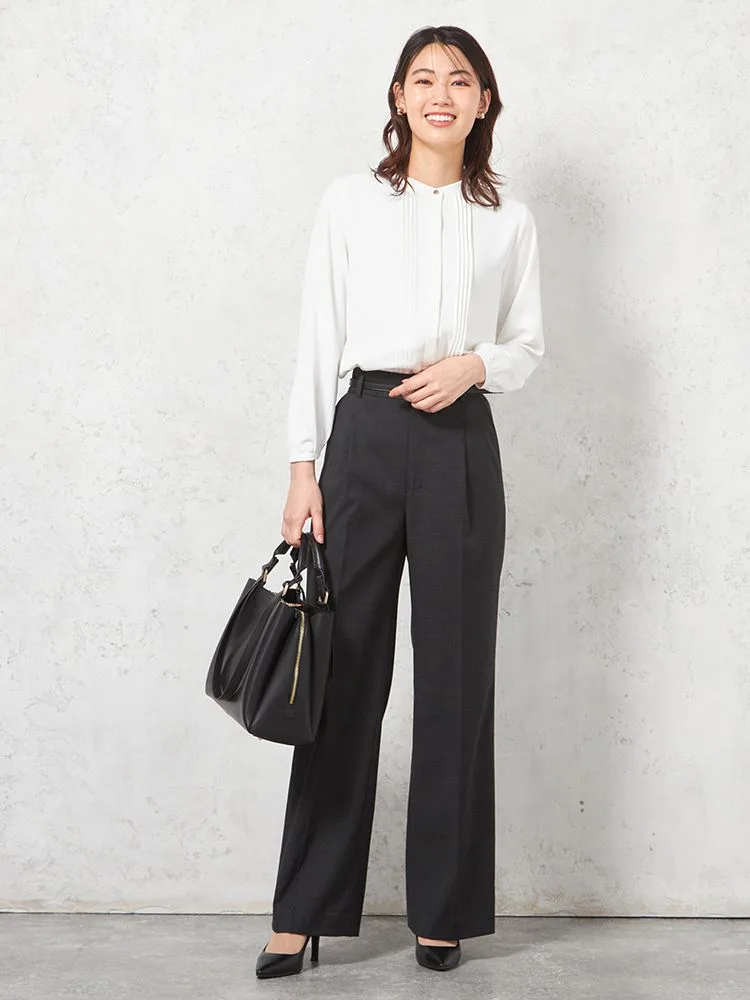 【働ラク肩ラクスーツ】パンツストレートウォッシャブルストレッチグレーストライプS&MWHITE秋冬【レディース】