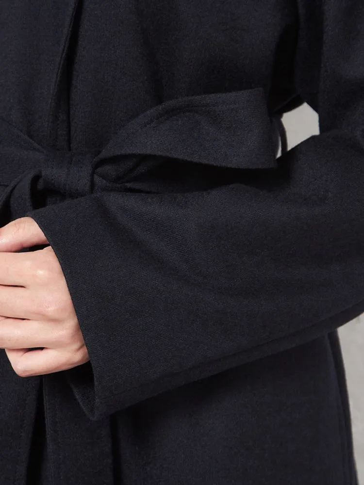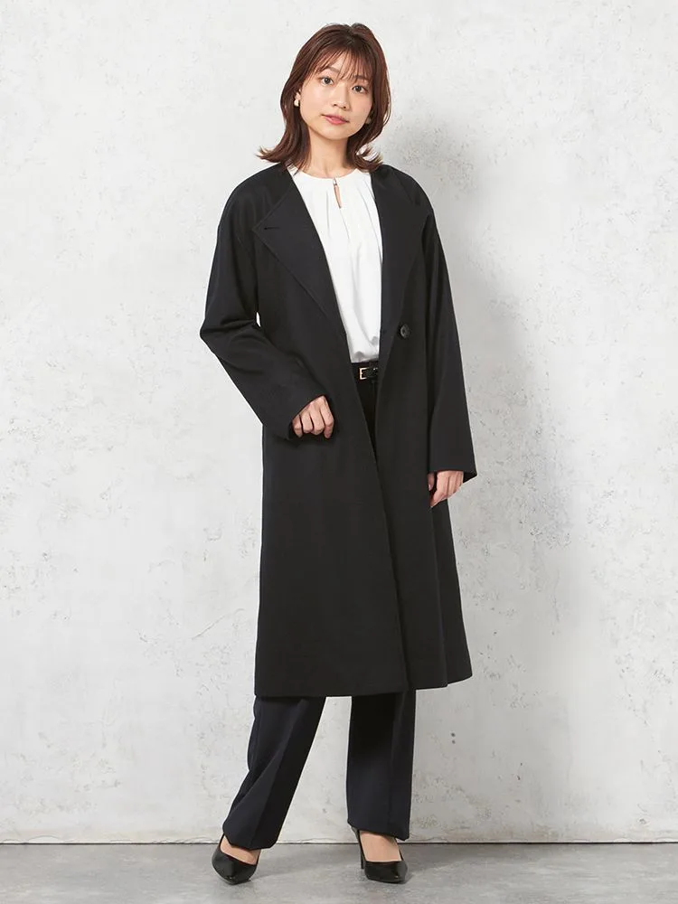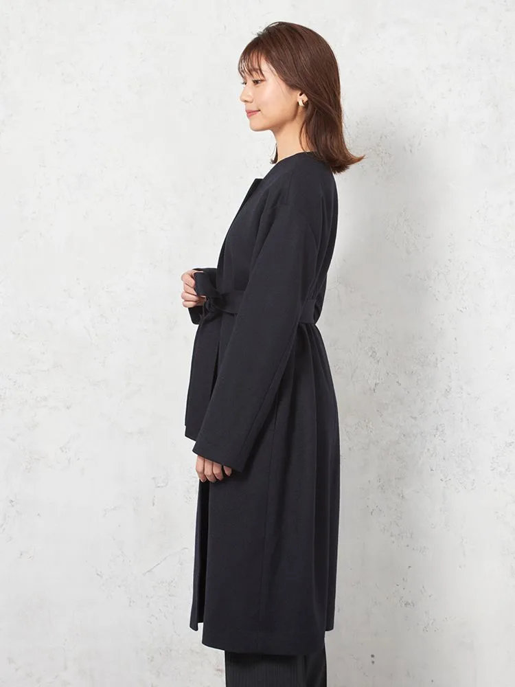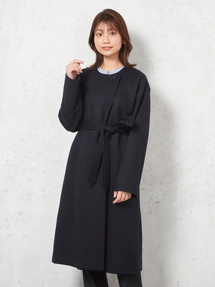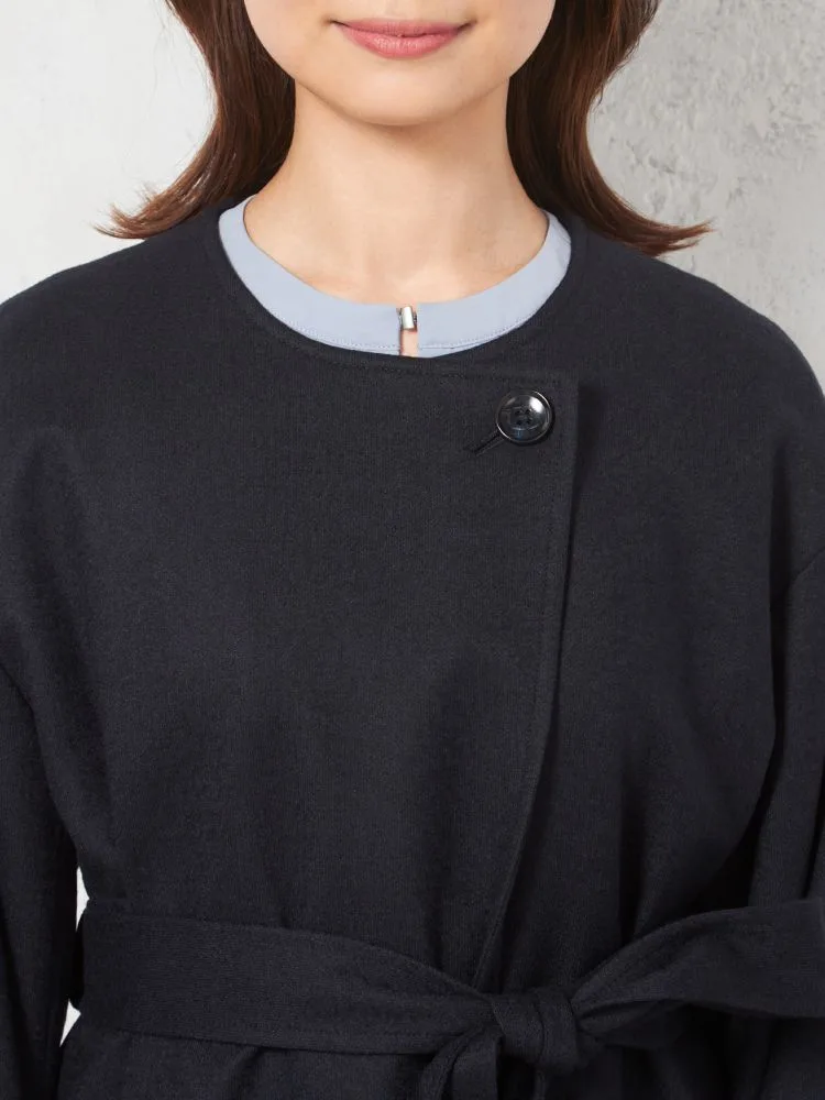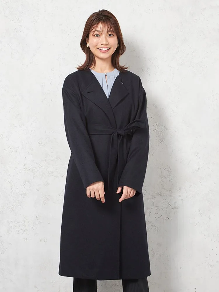 衿元のボタンの留め方でノーカラーorラペル付きに印象チェンジできる2WAY仕様。ウエストベルトでも着方のアレンジを楽しめます。