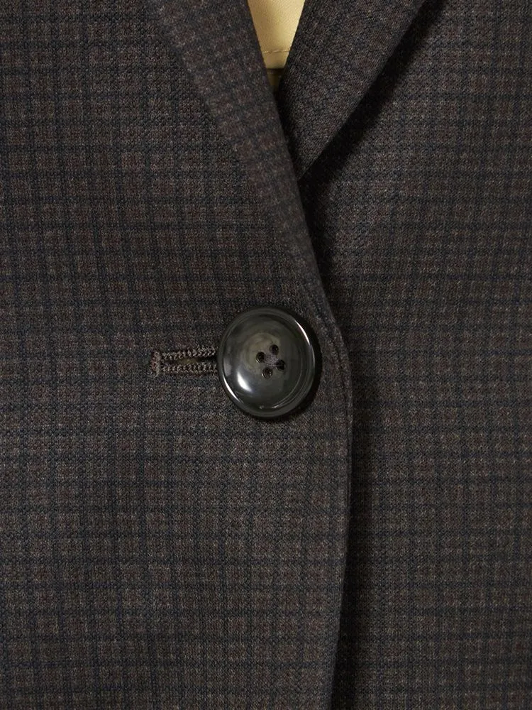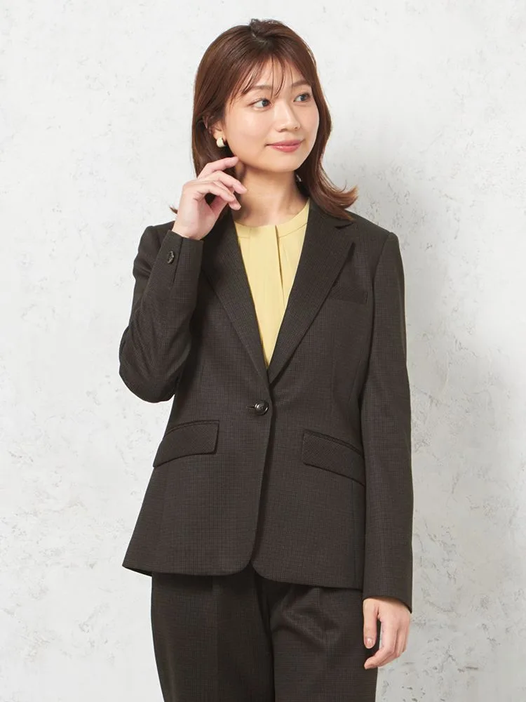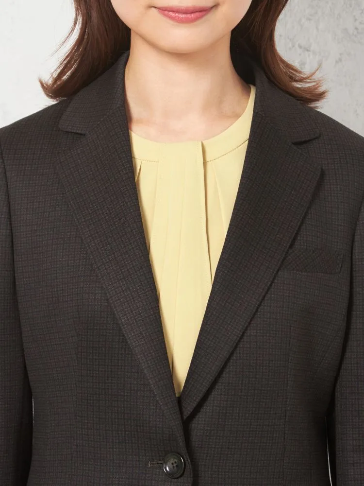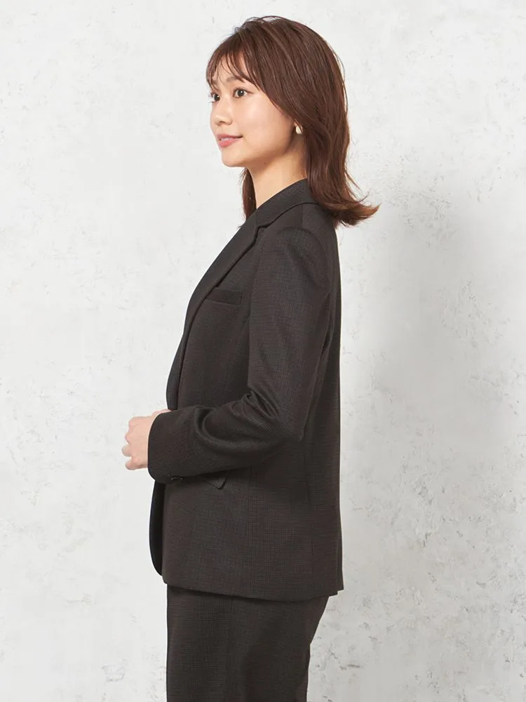 あわせるインナーや体型を選ばずに着られる1つボタン仕様、さりげないチェック柄がおしゃれ心を演出します。