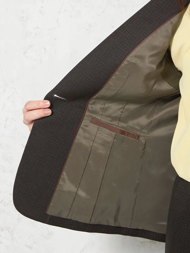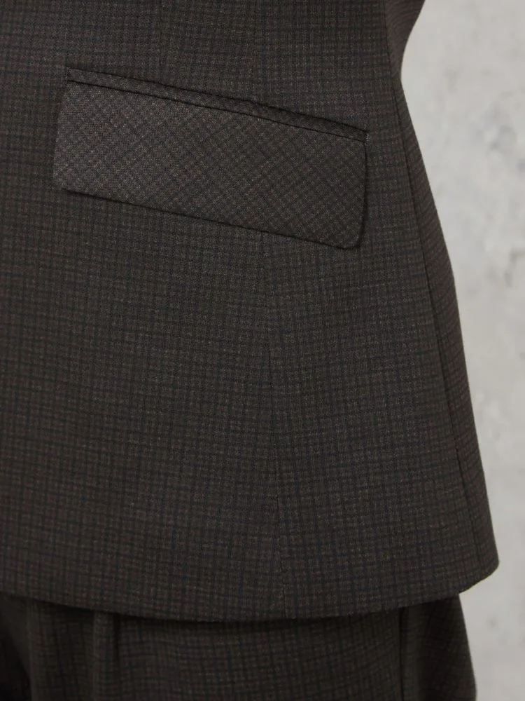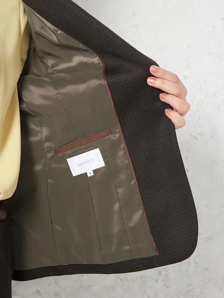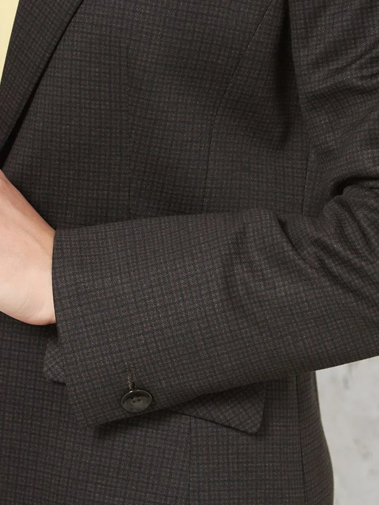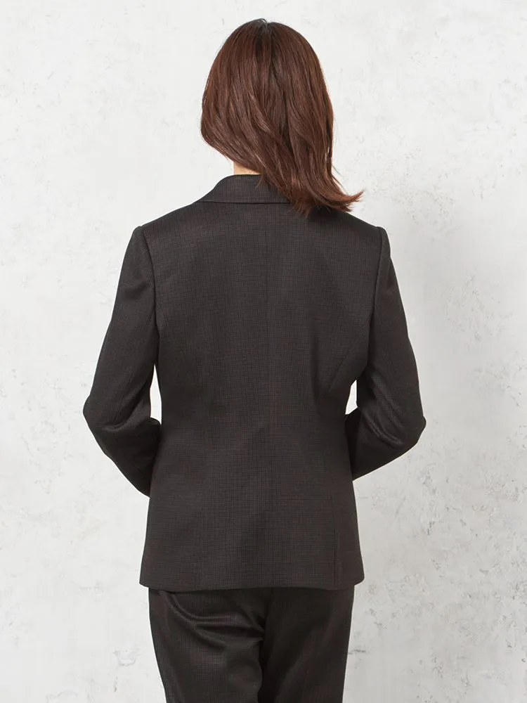 あわせるインナーや体型を選ばずに着られる1つボタン仕様、さりげないチェック柄がおしゃれ心を演出します。