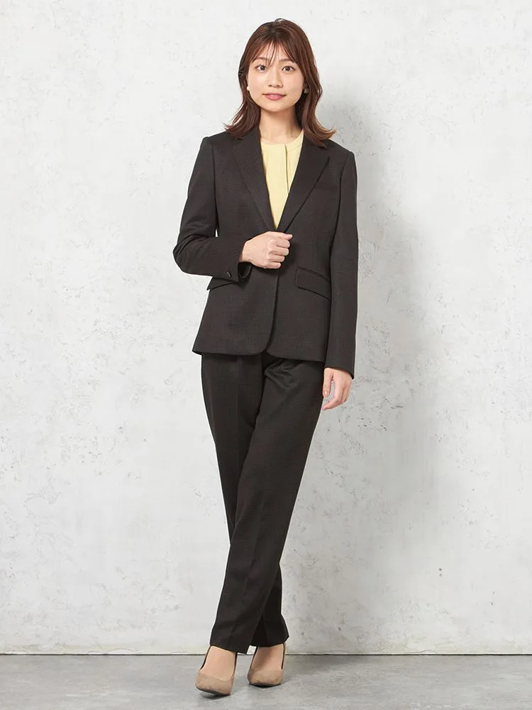 さらに肩周りと肘回りにトリコット裏地を使用した着心地抜群のパンツスーツ上下セットアップです。