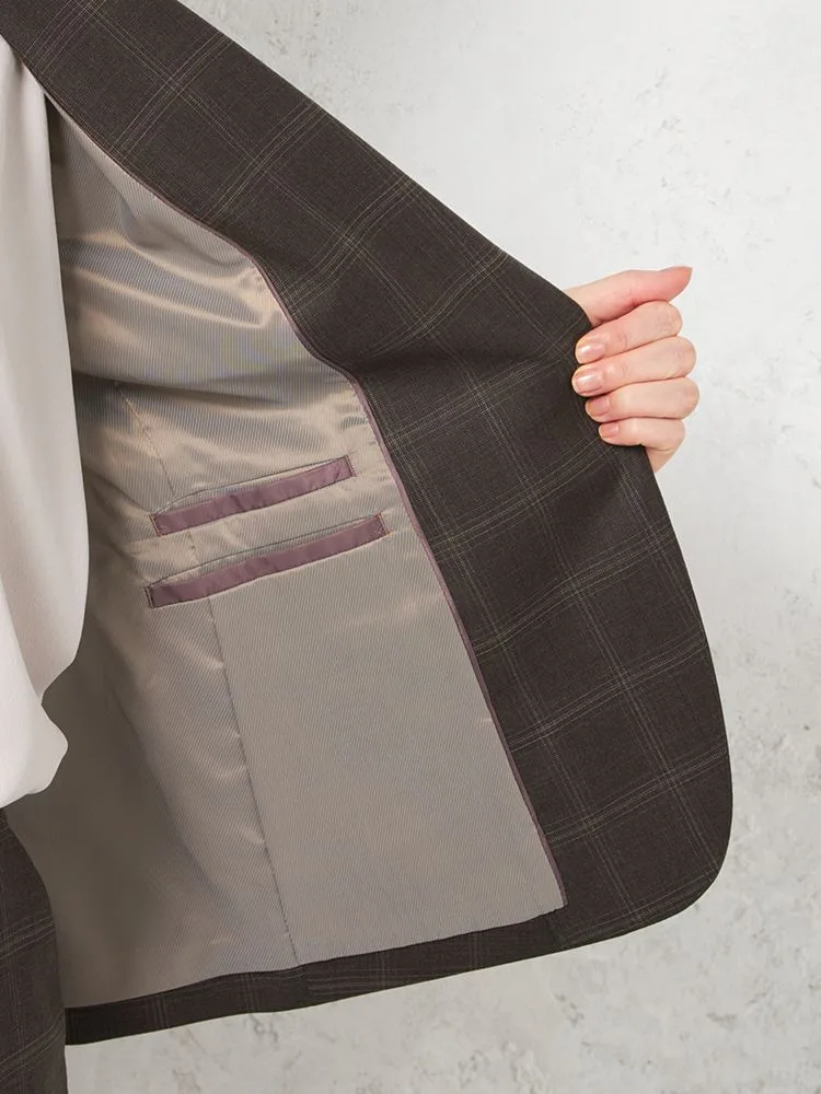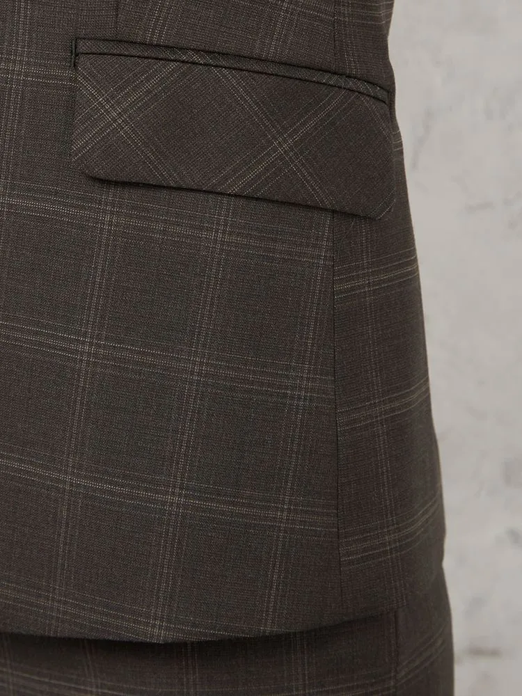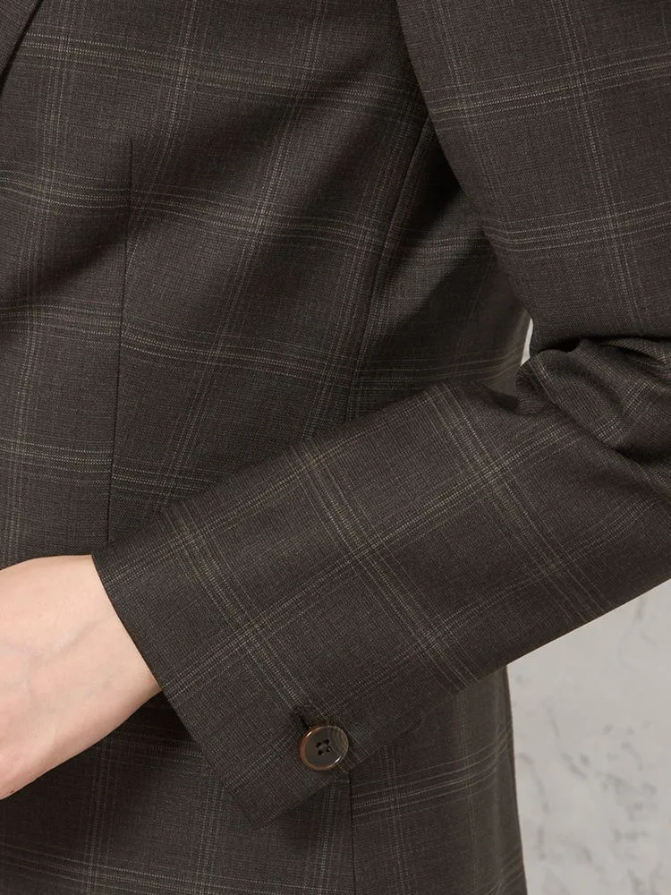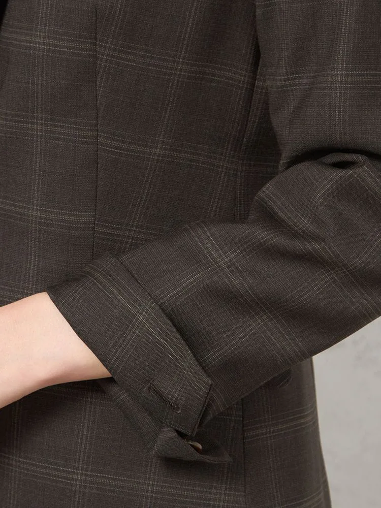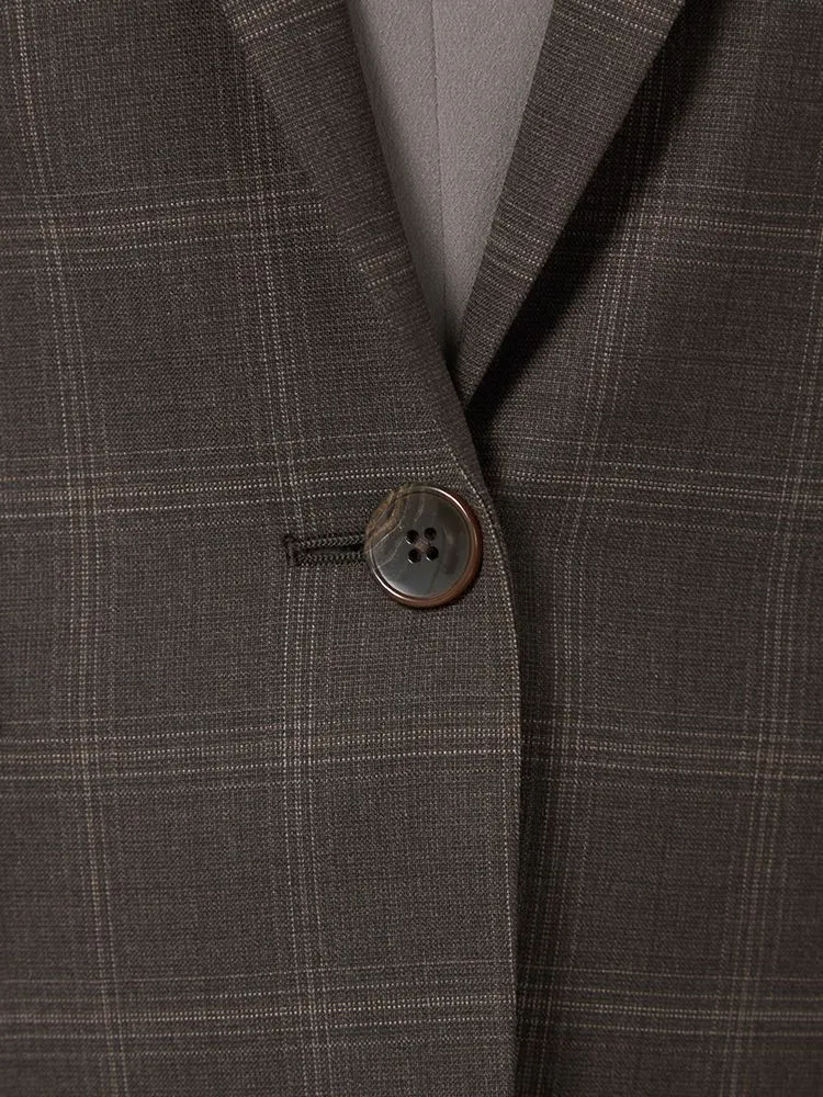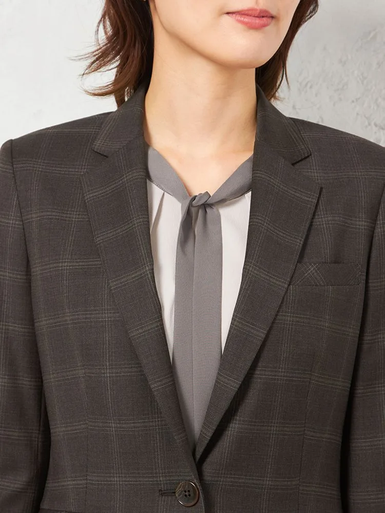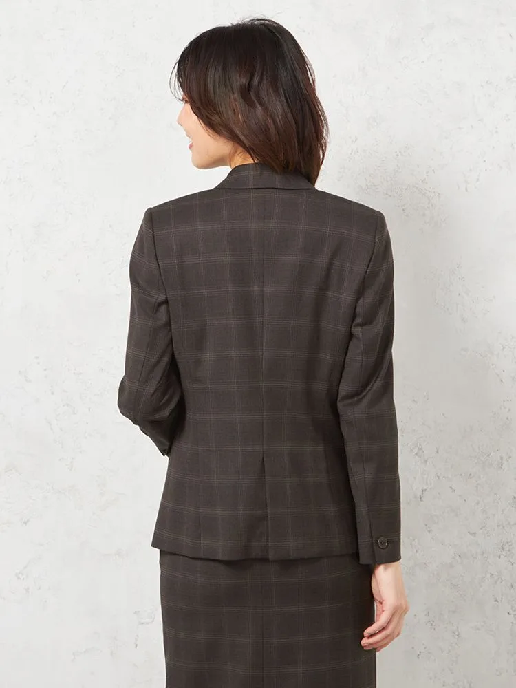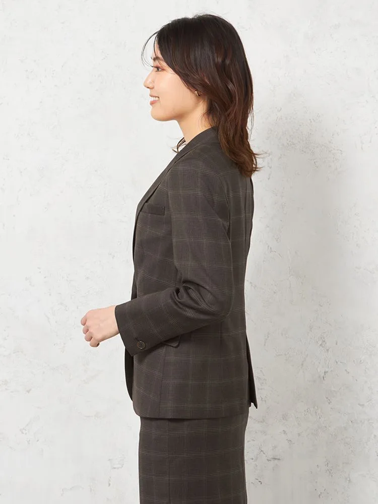 落ち着いた配色で主張しすぎないチェック柄のテーラードジャケット。