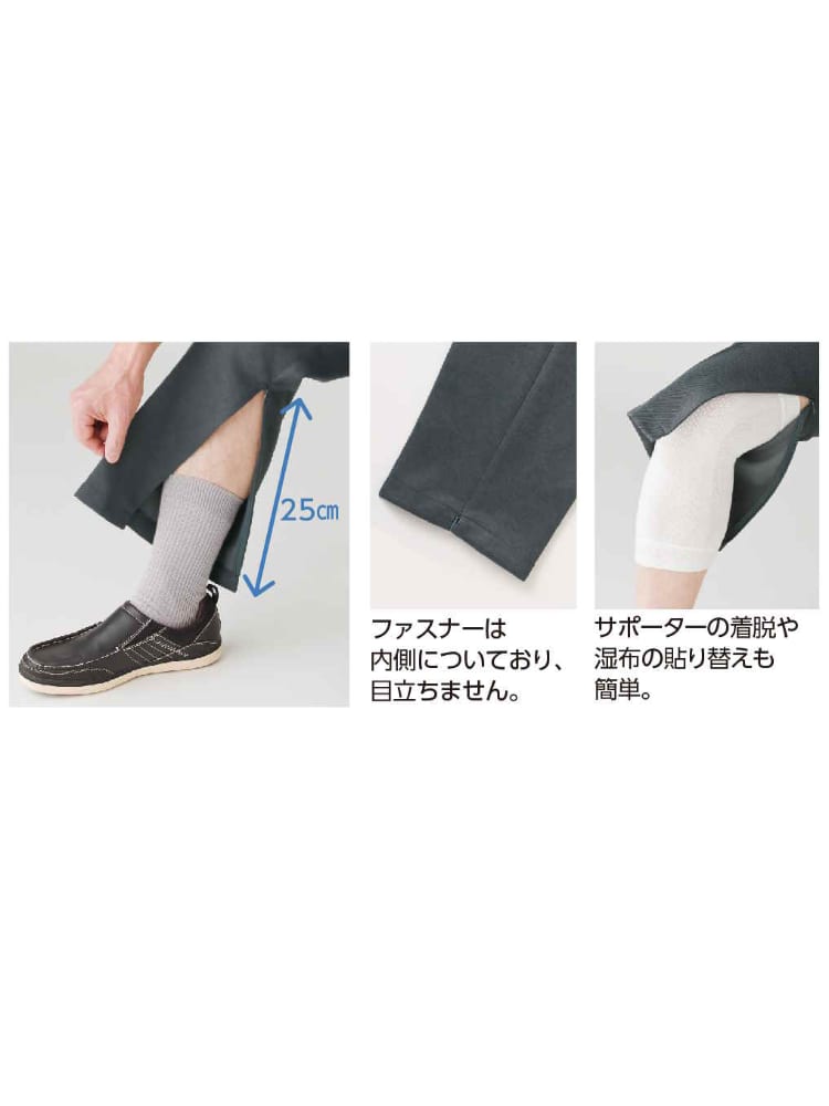湿布やサポーターをするときも便利!ファスナーは内側に同色であしらっていますので、普段は目立ちません。