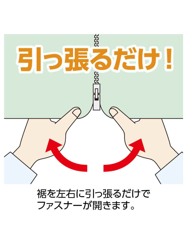 診療所などで足を見せる時、裾をまくるのは大変…そんな悩みを解決! 面倒だったパンツの着脱をしなくても、スッとファスナーを上下するだけでOK 。 より簡単に、裾を左右に引っ張るだけでも膝まで大きく開きます。 湿布やサポーターをするときも便利!ファスナーは内側に同色であしらっていますので、普段は目立ちません。 見た目は通常のパンツなので、おしゃれに軽やかに装ってください。