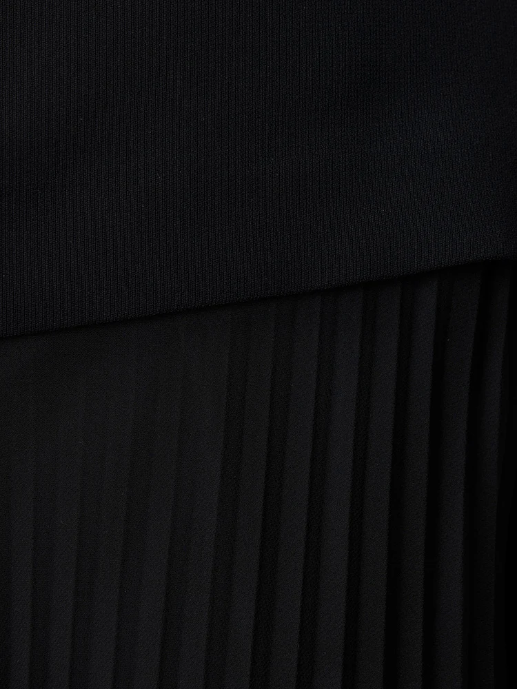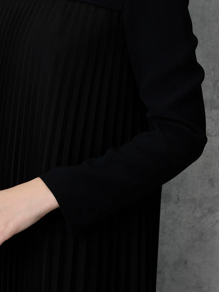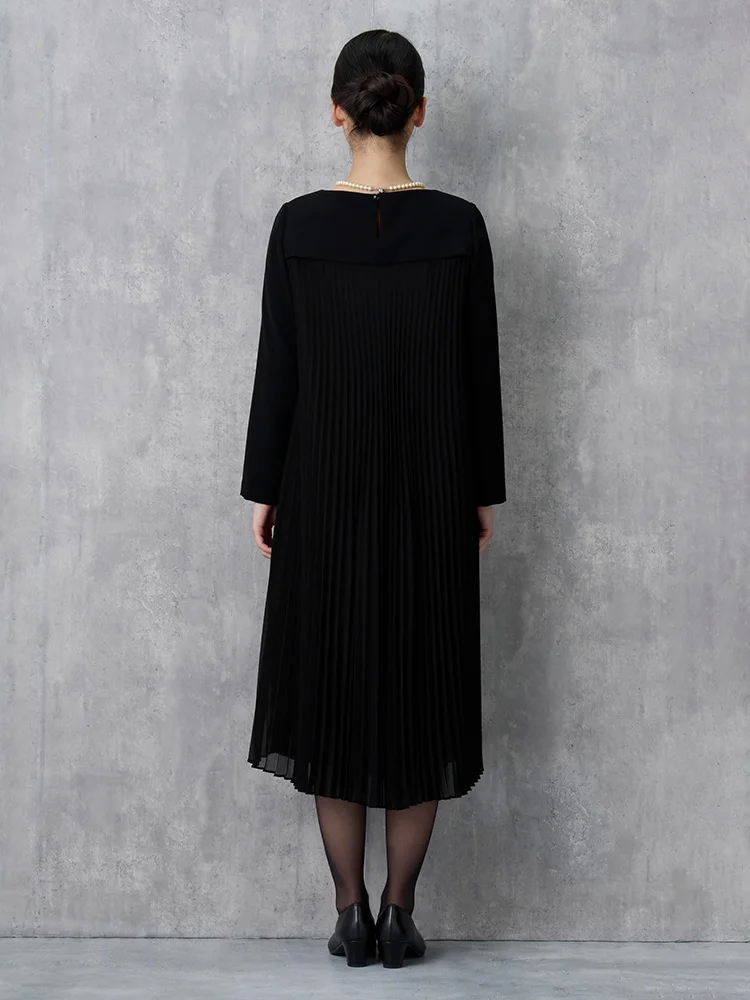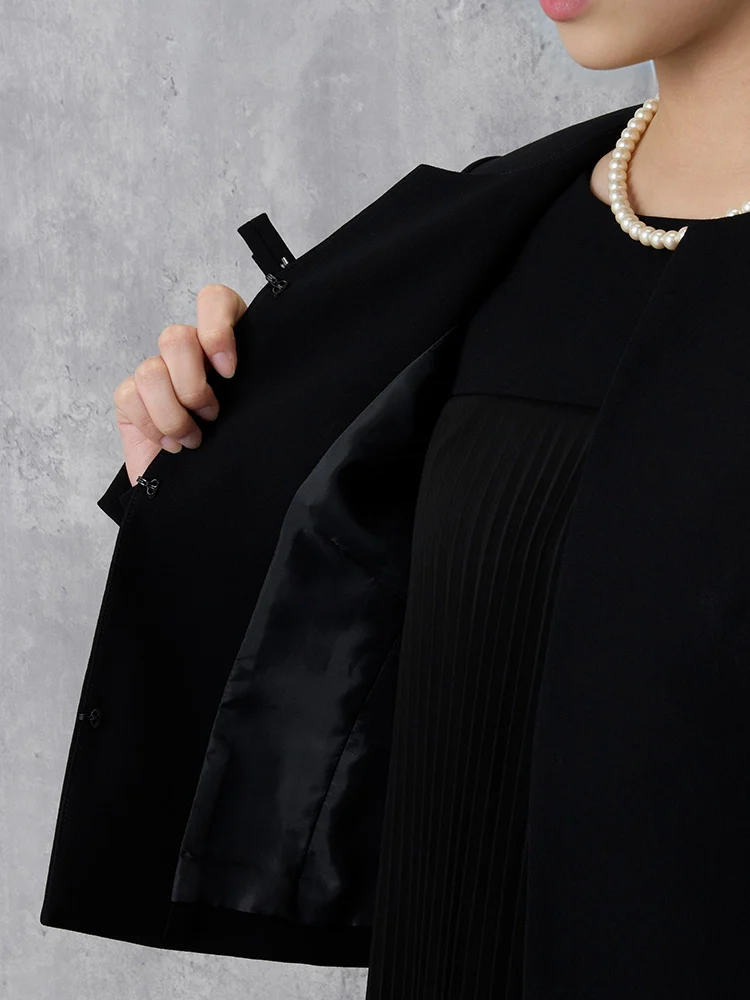 プリーツ仕立てのワンピースと、ノーカラージャケット、ネックレスが付いた3点セットフォーマル。