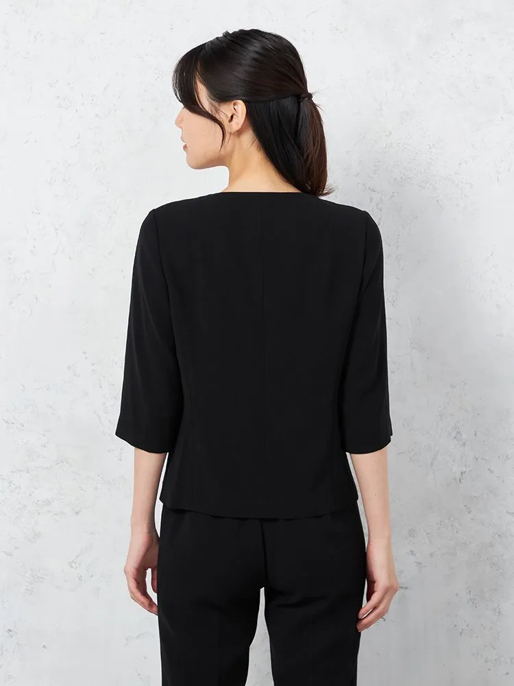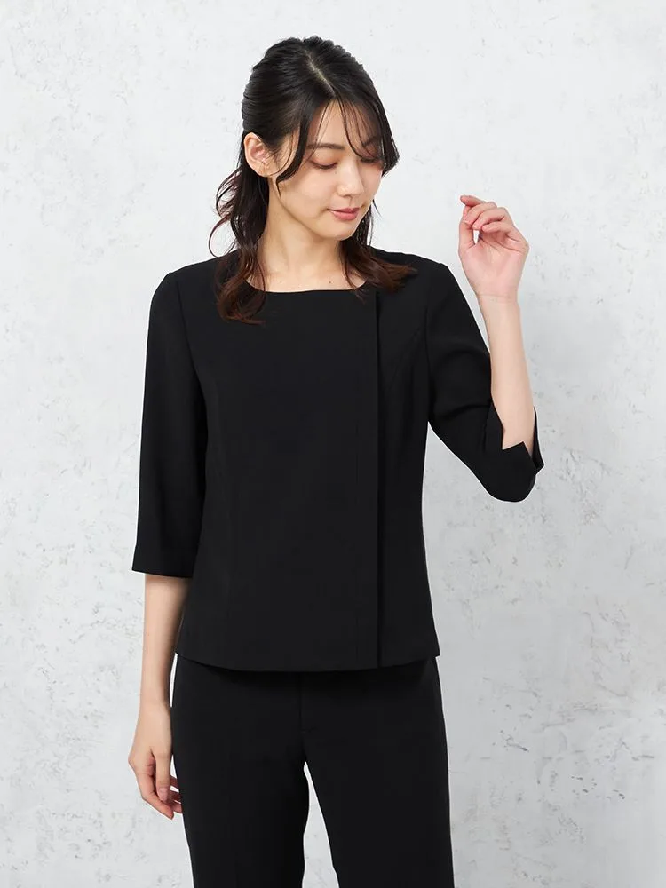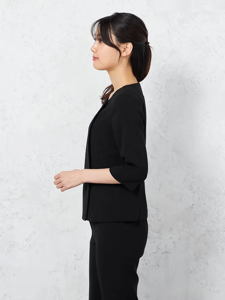 7分袖のブラウスとスラックス、テーラードジャケットを組み合わせ、着用シーズンによってアレンジができるアイテムにしました。