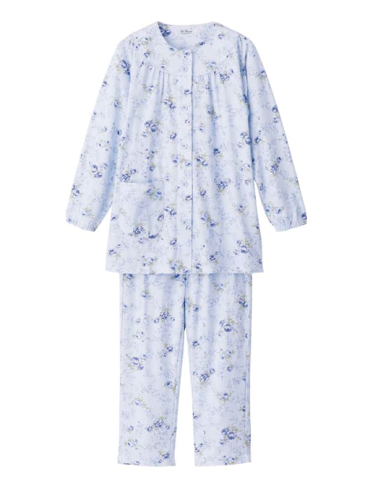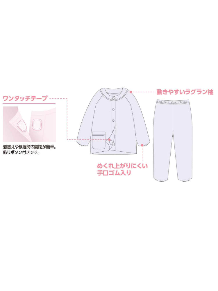 着替えや検温時の開閉が簡単。飾りボタン付で見た目は普通のパジャマです。