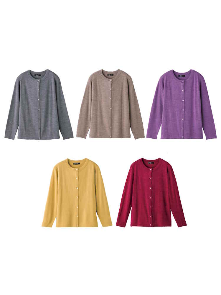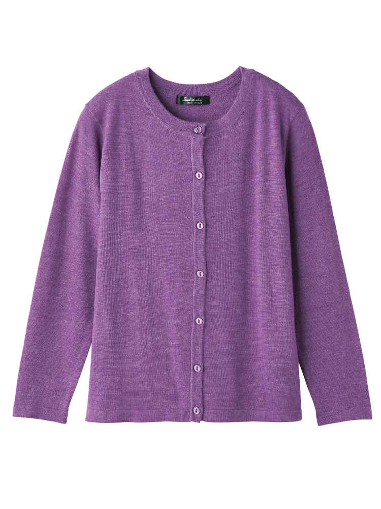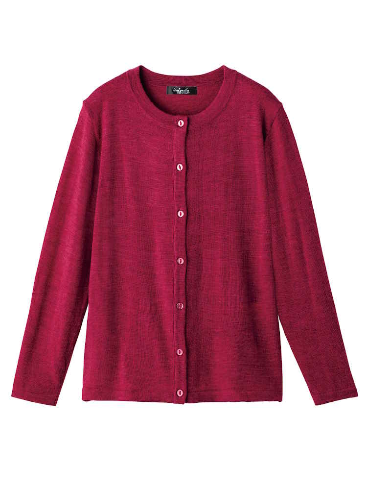 発色のいいなめらか素材のカーディガン。生地にビエラヤーンを使用しています。