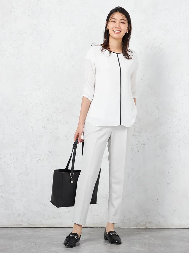 首元から身頃にかけて入れたパイピングのアクセントが、淡めカラーを引き締めて上品な印象に。