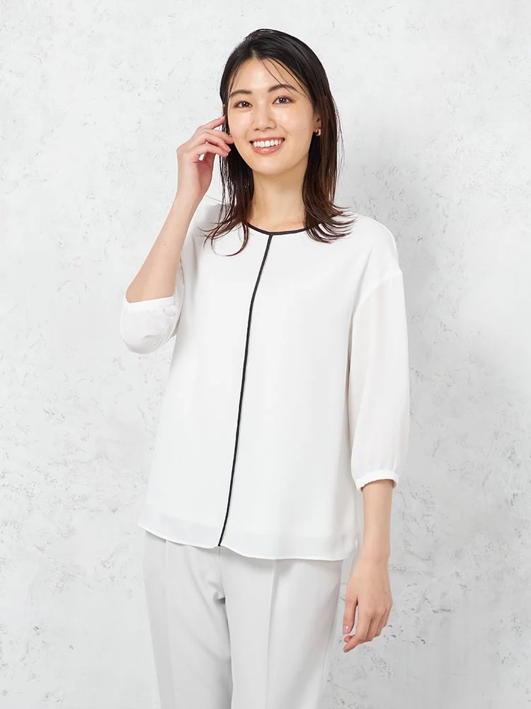 【INDIVI】ブラウス 7分袖 ジョーゼット 2枚重ね 配色パイピングブラウス ウォッシャブル 無地 通年【レディース】(S.ブルー)