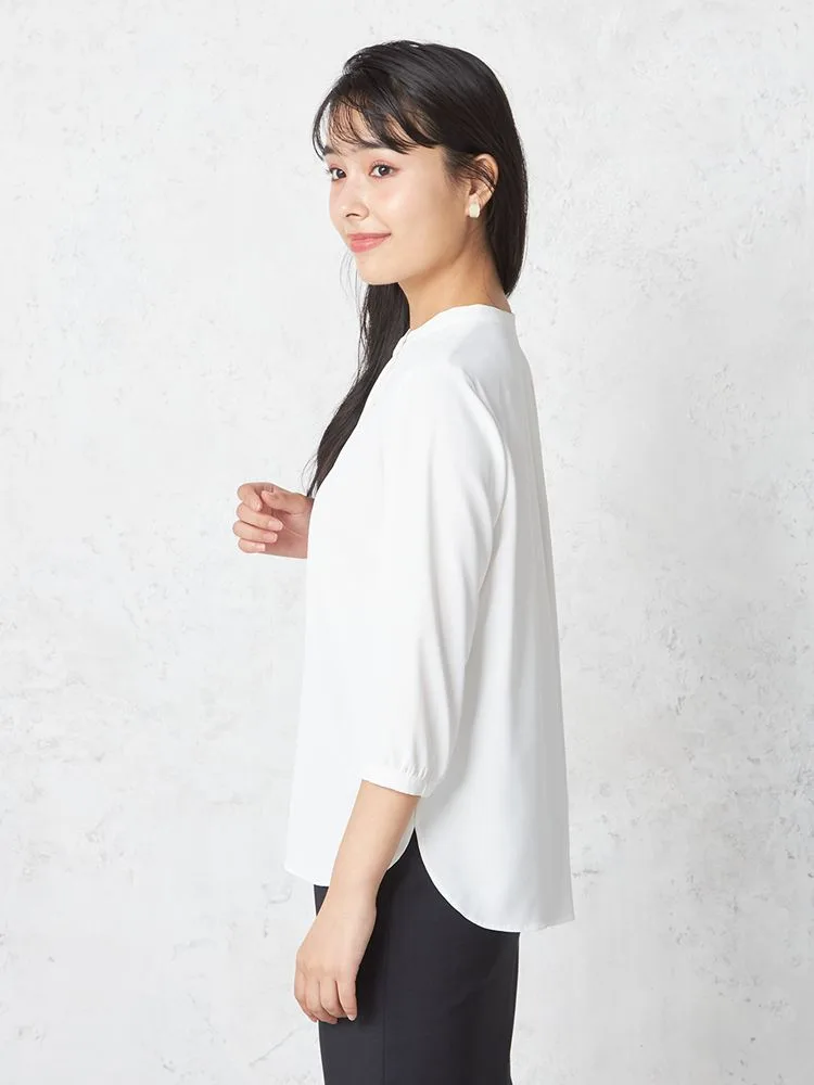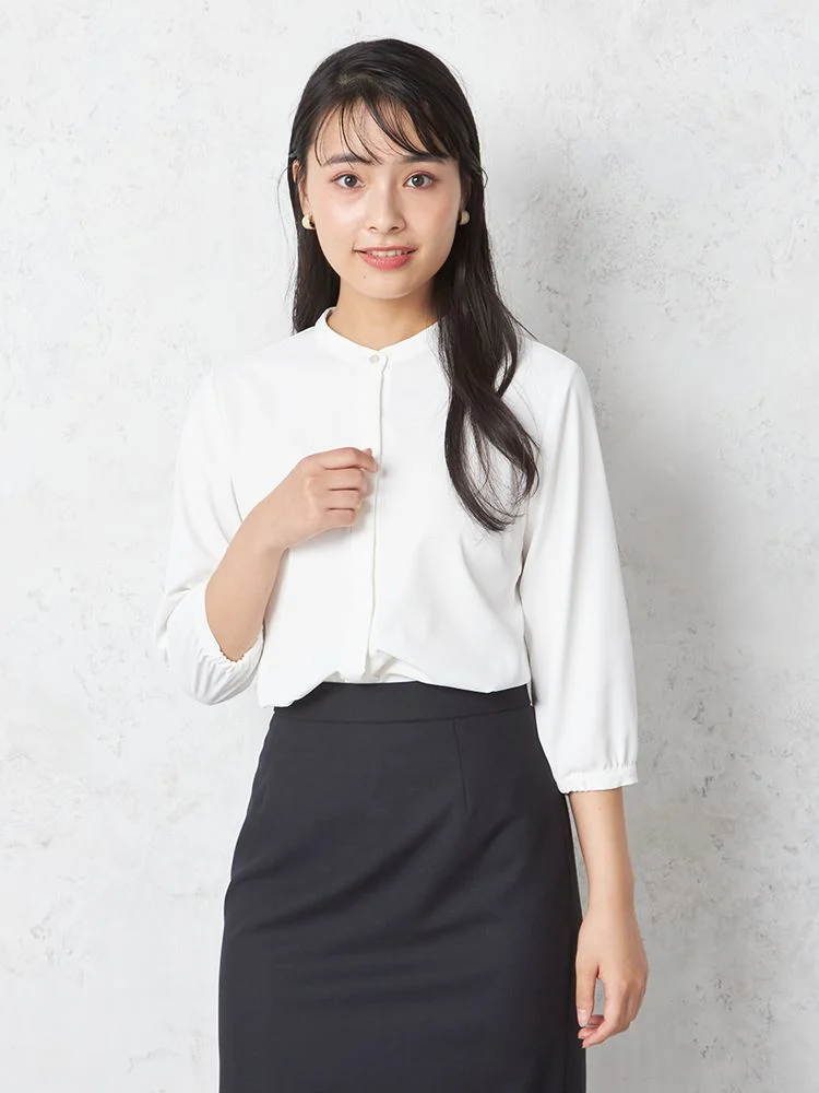 首もとのメタルボタンが上品なワンポイントになったブラウス。