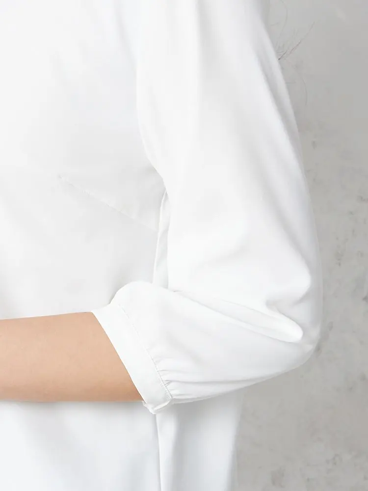 手首の見える七分袖で軽やかさを演出しながら、袖口ギャザーでフェミニンなエッセンスをプラス。