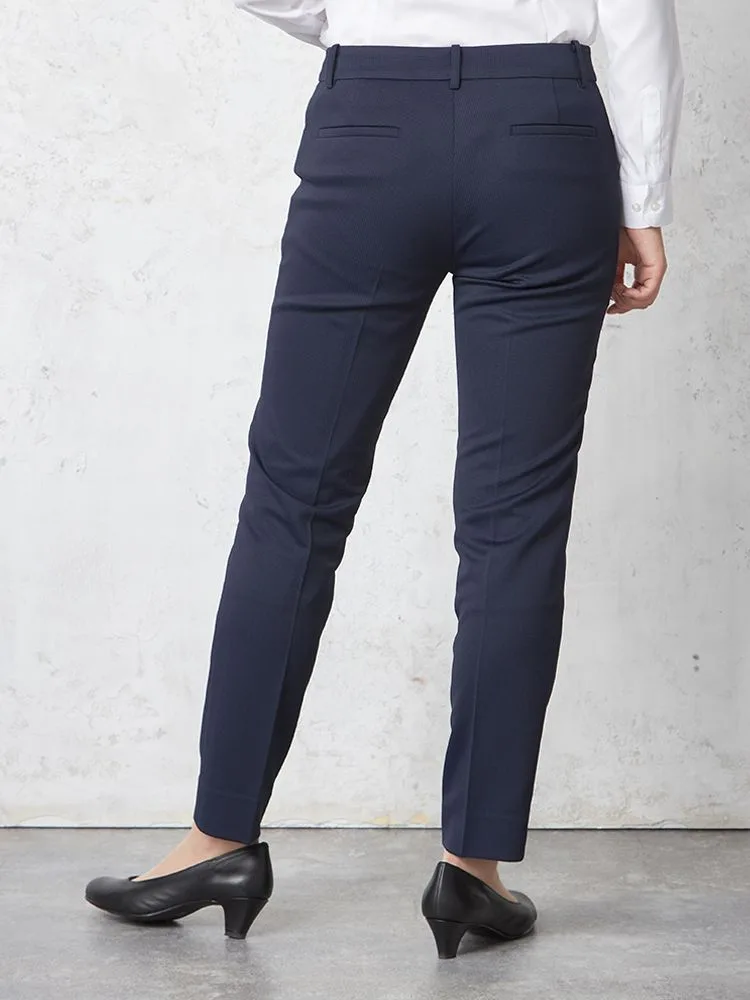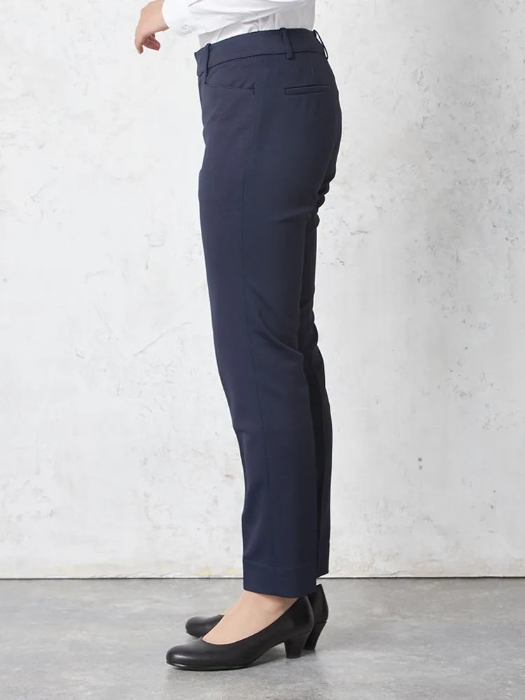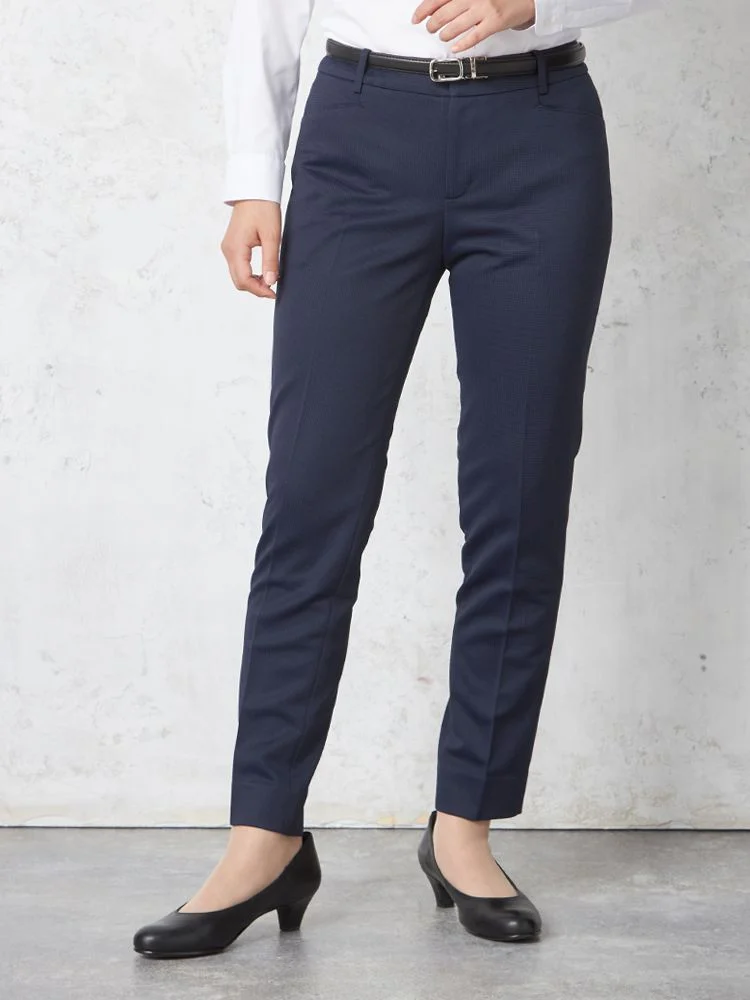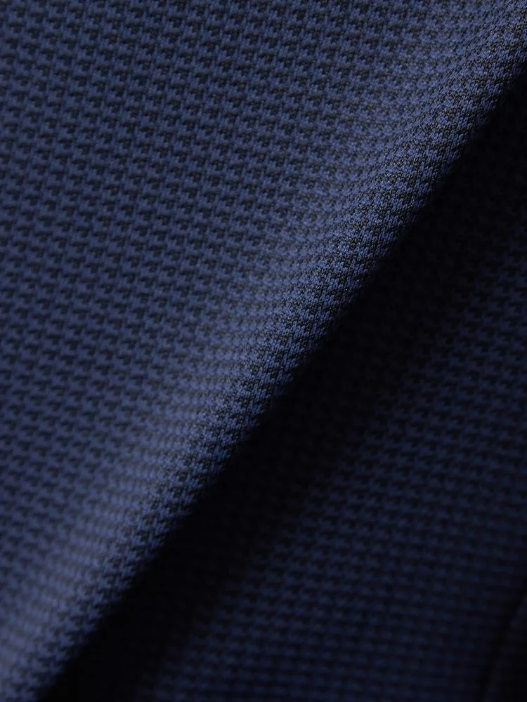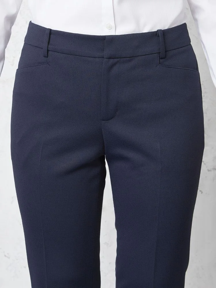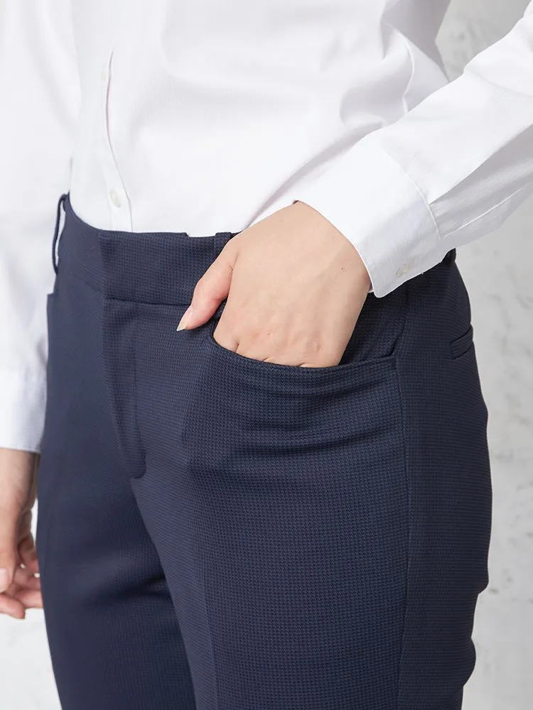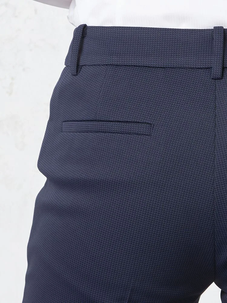 ストレッチニット素材で動きやすい、ネイビー千鳥柄ニットスーツパンツ。