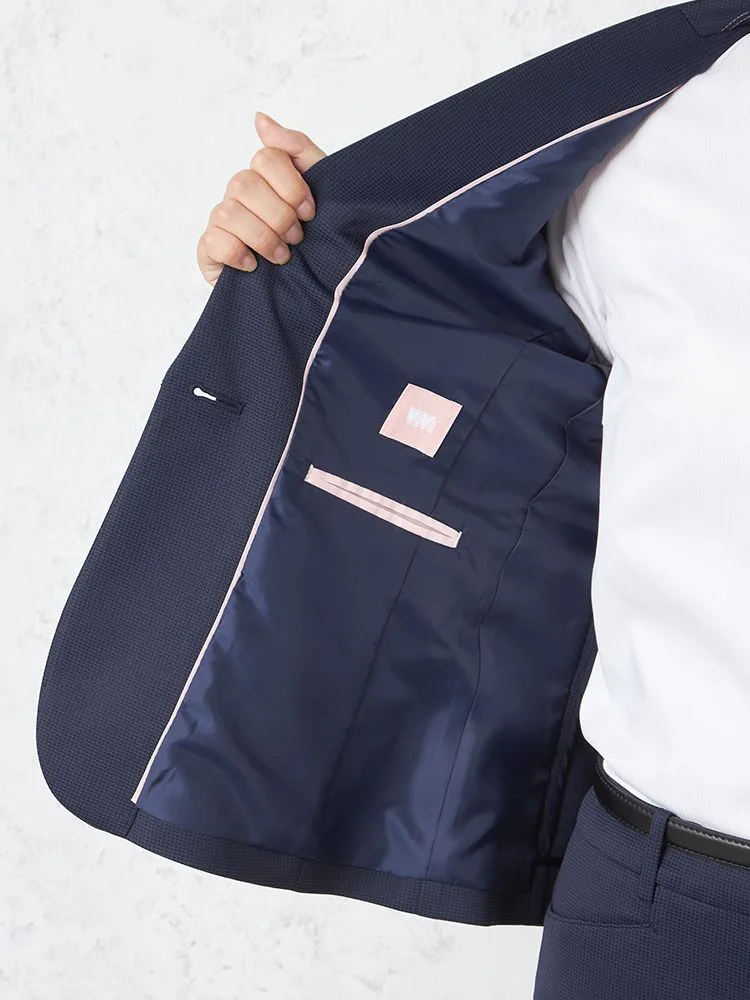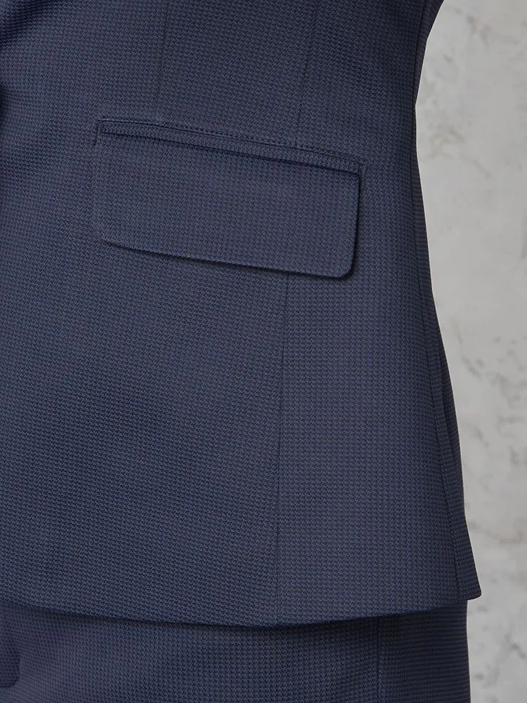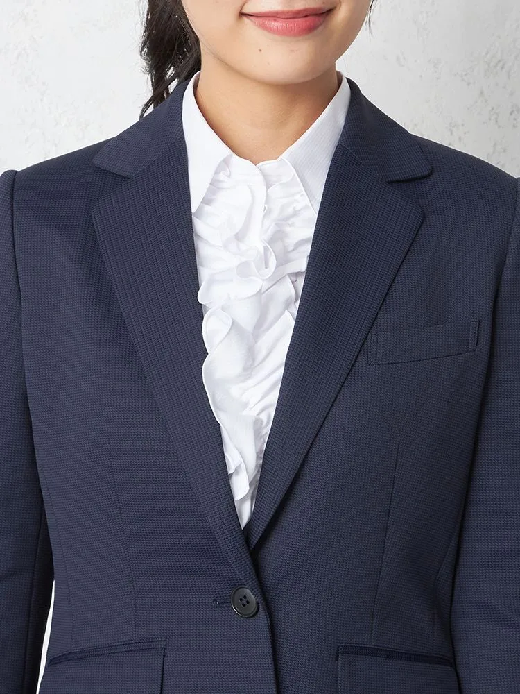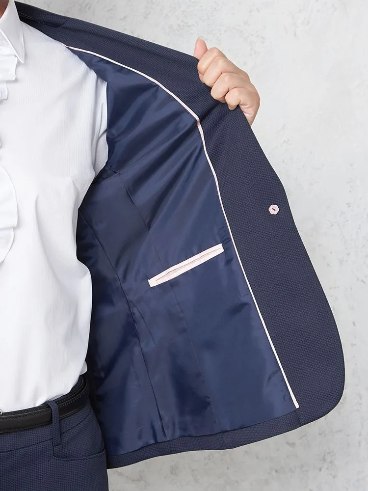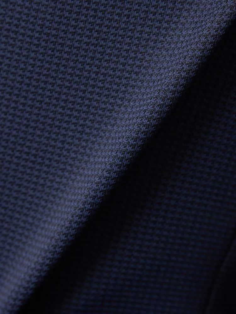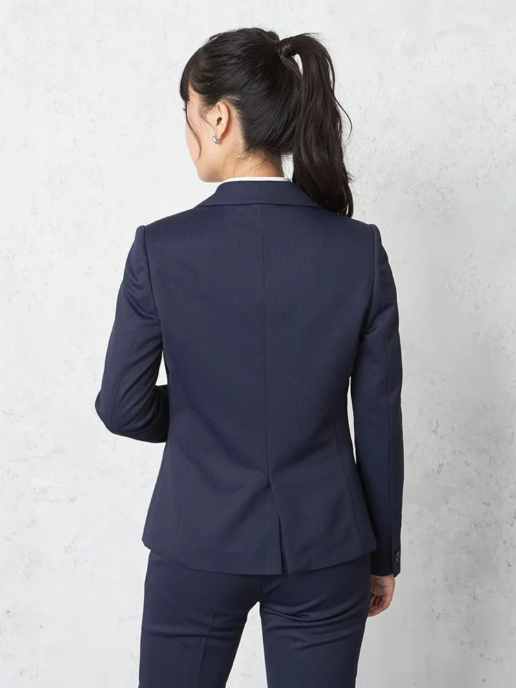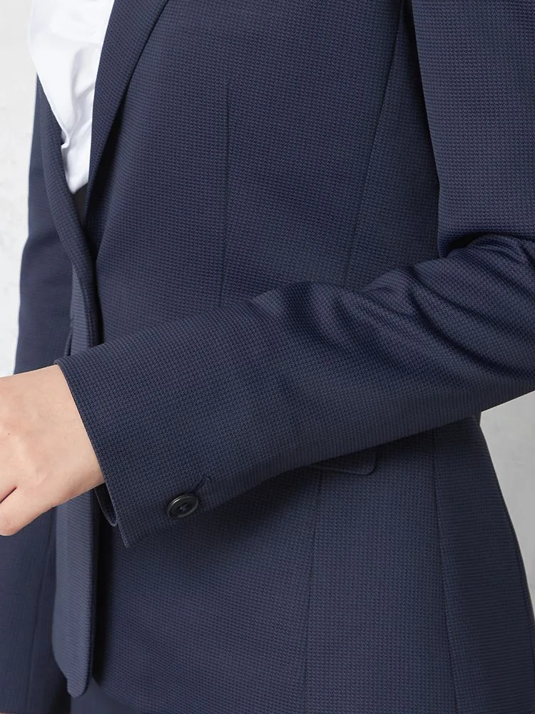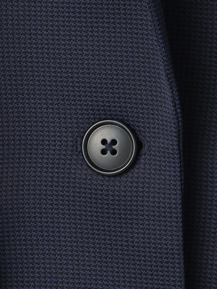 ストレッチニット素材で動きやすい、ネイビー千鳥柄ニットスーツジャケット。