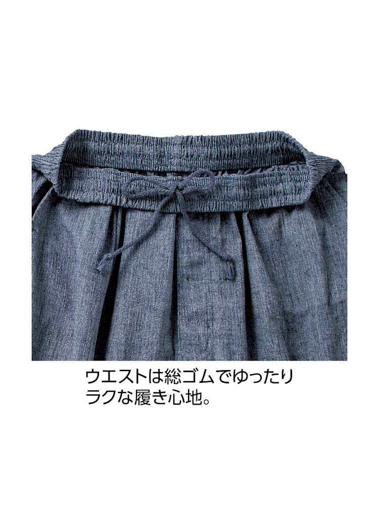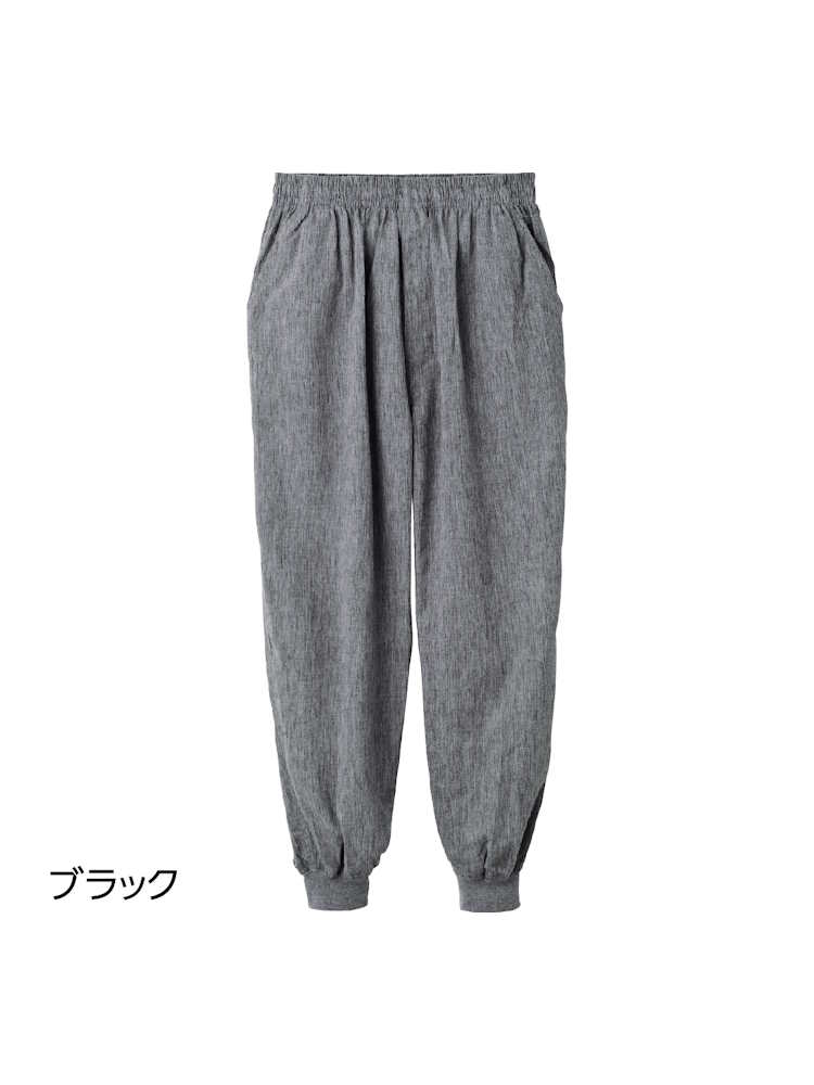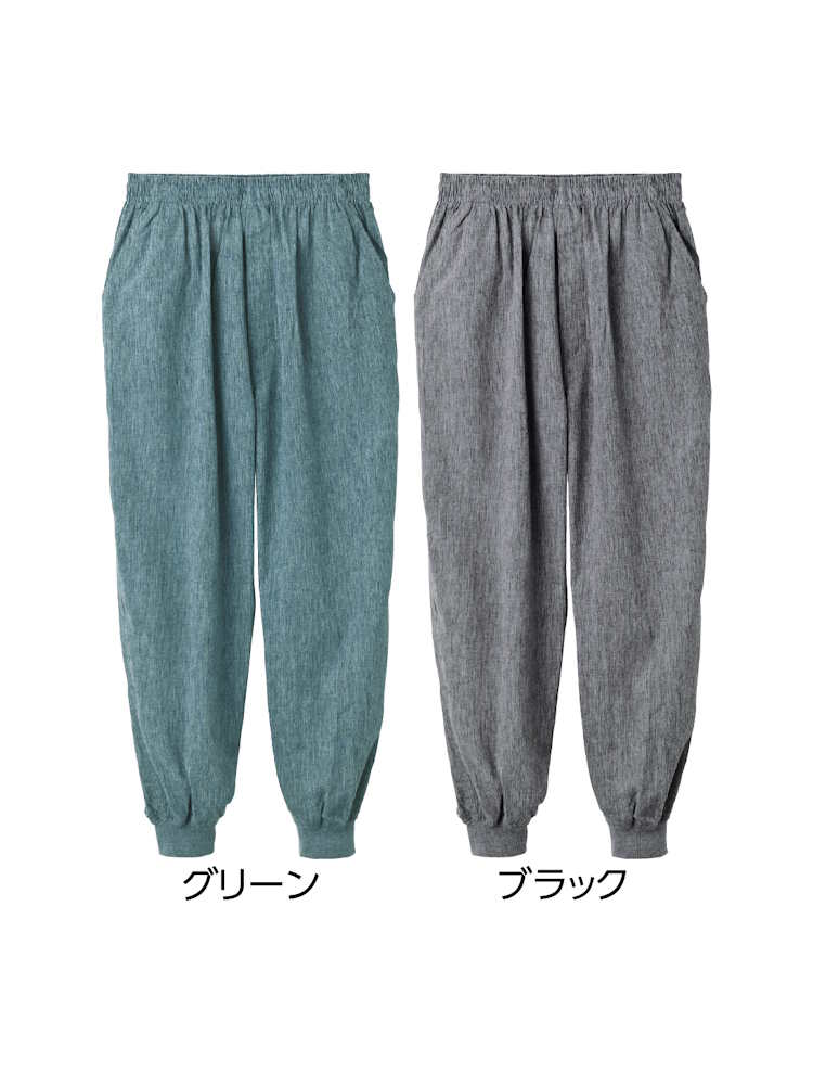 涼しい素材と足首リブ仕上げで、見た目もすっきりしながら動きやすいパンツ。麻混楊柳素材でサラッとした肌触りが人気。お散歩や家の中など、どんな場面でも活躍する日常使いにぴったりのパンツです。ウエストは総ゴムでゆったりラクな履き心地です。