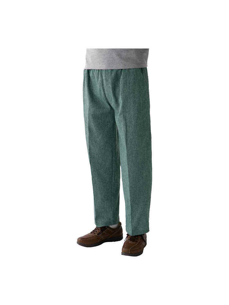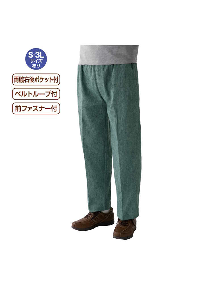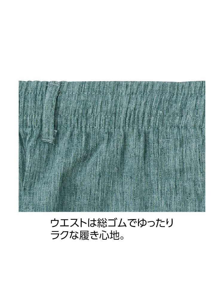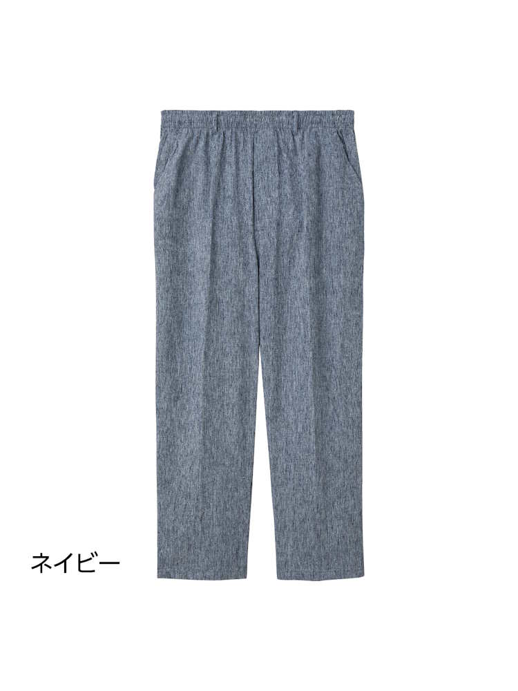 涼しげな風合いのパンツは夏の必需品。お散歩や家の中など、どんな場面でも活躍する着心地ラクラクのストレートタイプです。麻混楊柳素材でサラッとした肌触りが人気。ウエストは総ゴムでゆったりラクな履き心地です。
