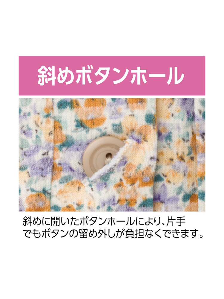 つかみやすい大きめのボタンと斜めボタンホールで留め外しがラクにできます。