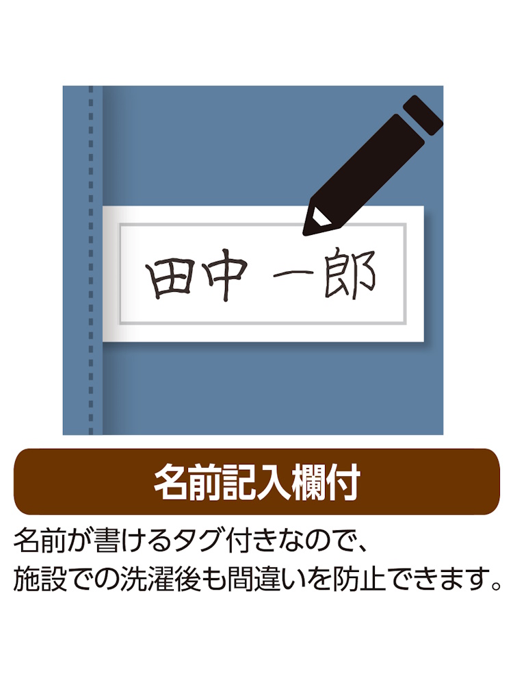 名前が書けるタグ付きなので、施設での洗濯後も間違いを防止できて安心。