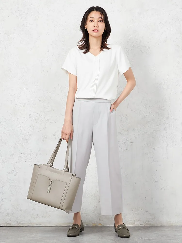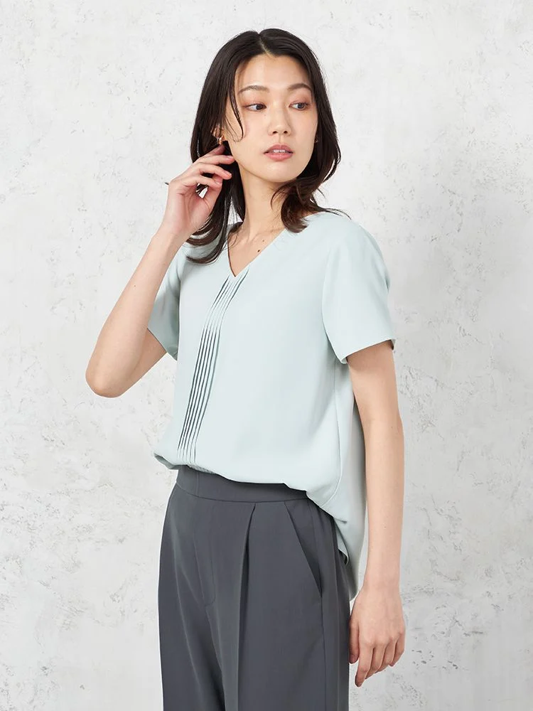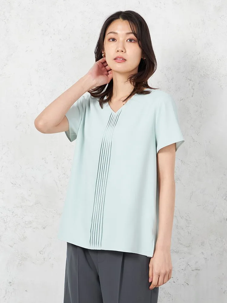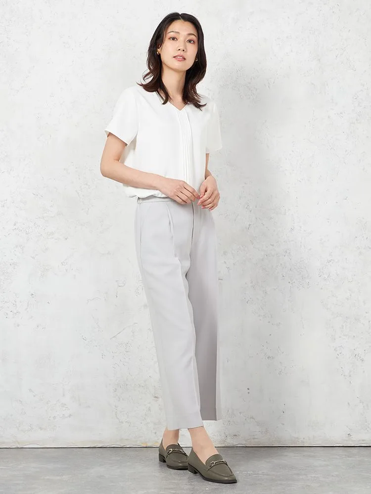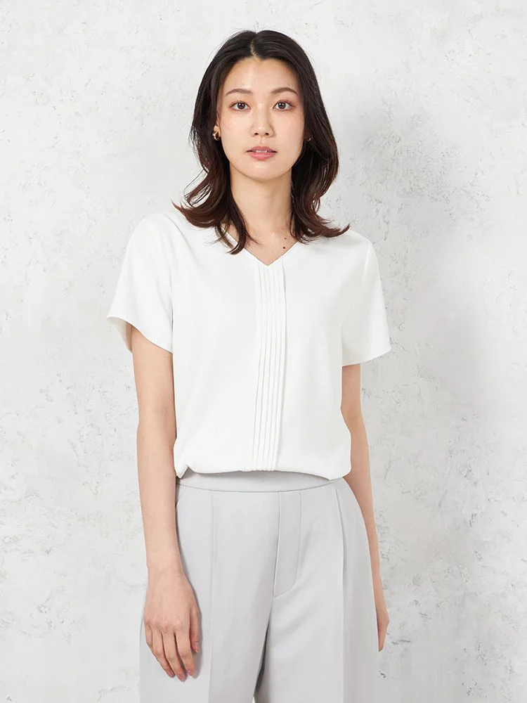 【INDIVI】ウォッシャブル ソフトクレープ 半袖 Vネック タックブラウス 無地 春夏【レディース】(オフホワイト)