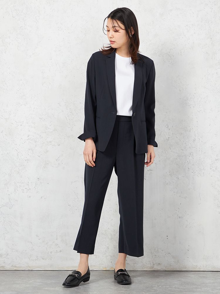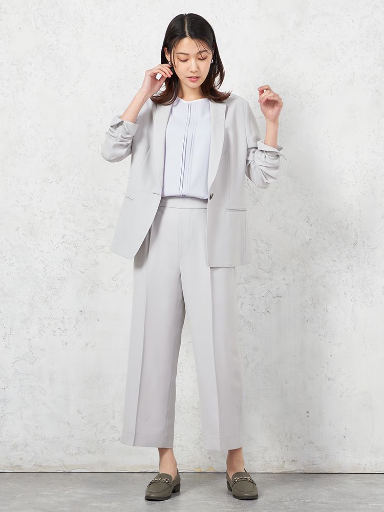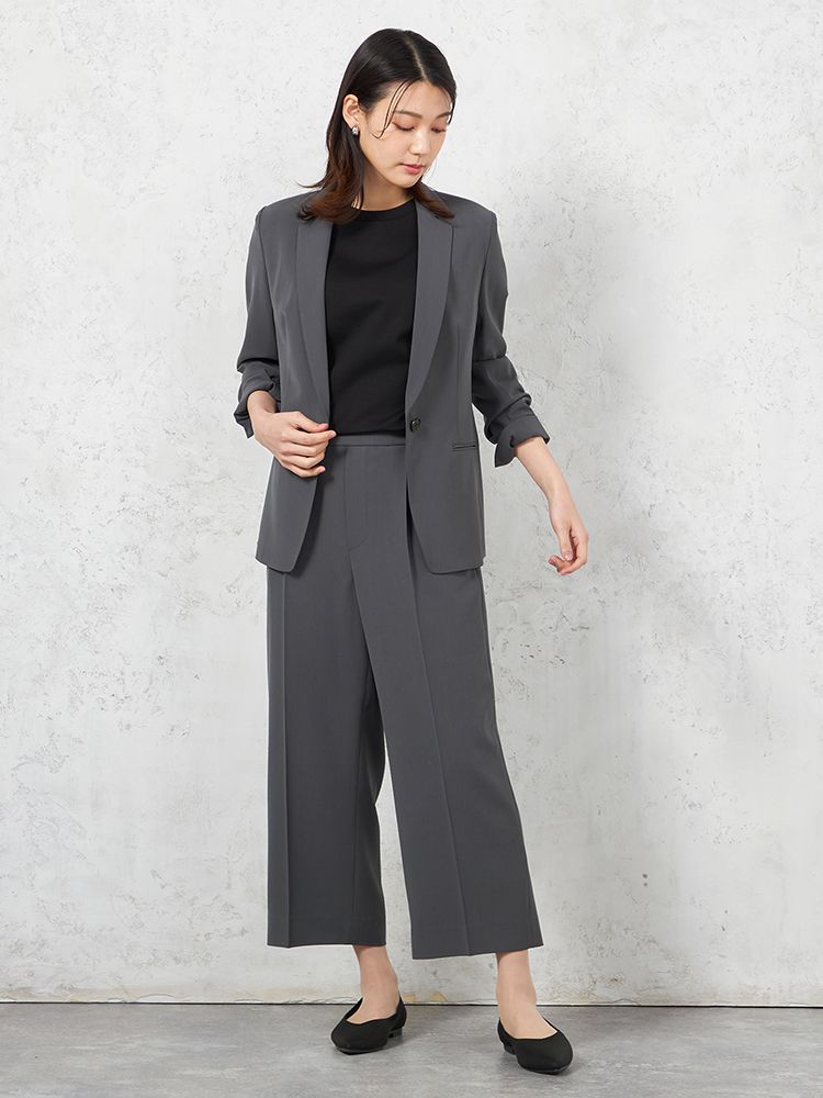 同素材のパンツやトップスと合わせたセットアップスタイルは、学校行事、通勤用として幅広く活躍します。