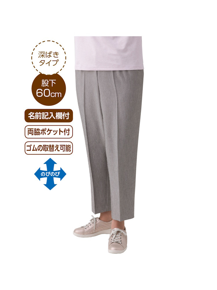 【深履き】【7分丈】杢調ストレッチ深履きパンツ/婦人用/レディース/シニア/高齢者/股下60cm/名前記入欄付/両脇ポケット/ズボン/ストレッチ/M,L,LL,3L 【CF】(ベージュ)
