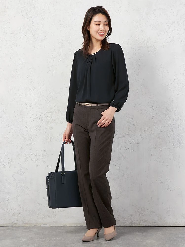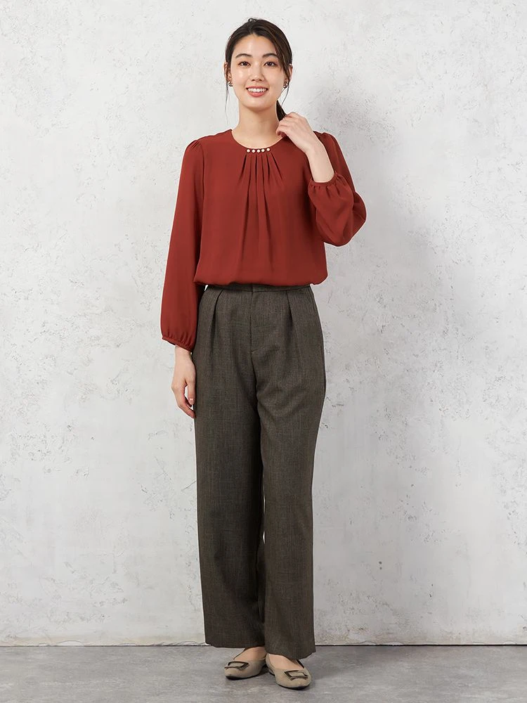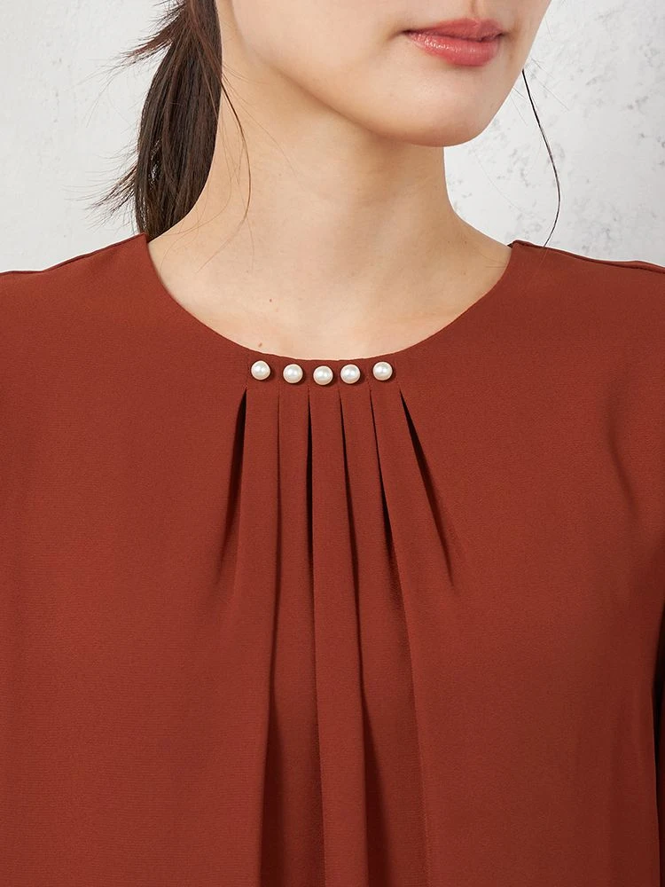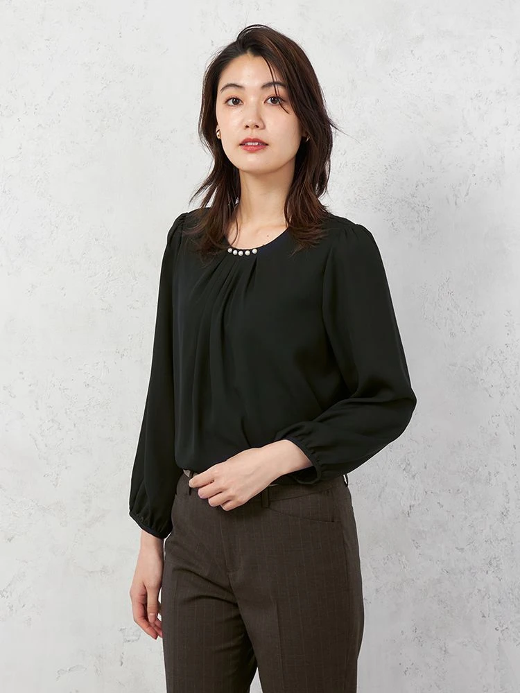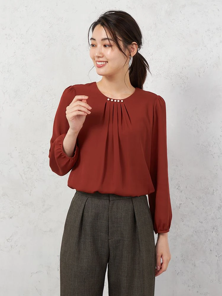 アクセサリーなしでもおしゃれに着られる5連パールがポイントのプルオーバーブラウス。